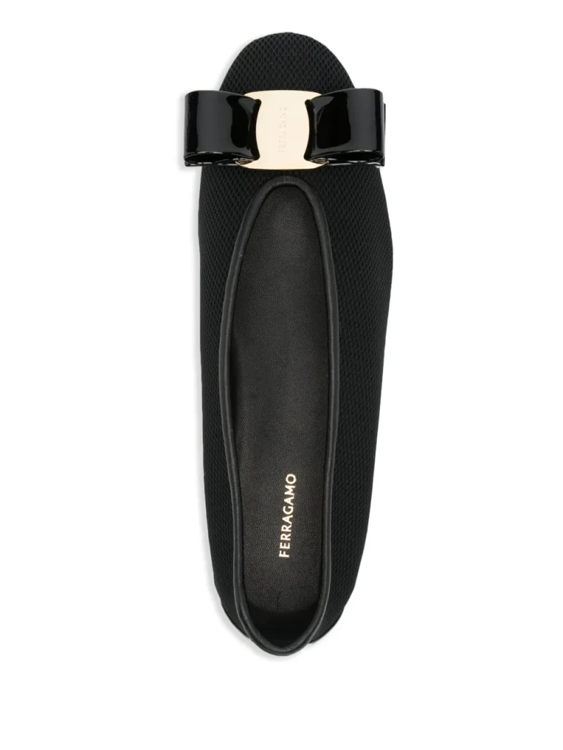 Balerini Ferragamo Vara Ballet Flats negru, din mix te materiale, cu profil jos, decorati cu logo Ferragamo metalic, tesatura mesh, talpa din piele si bot rotund. 100% textil; 100% piele de vitel; 100% textil; 100% cauciu; 100% piele de vitel;