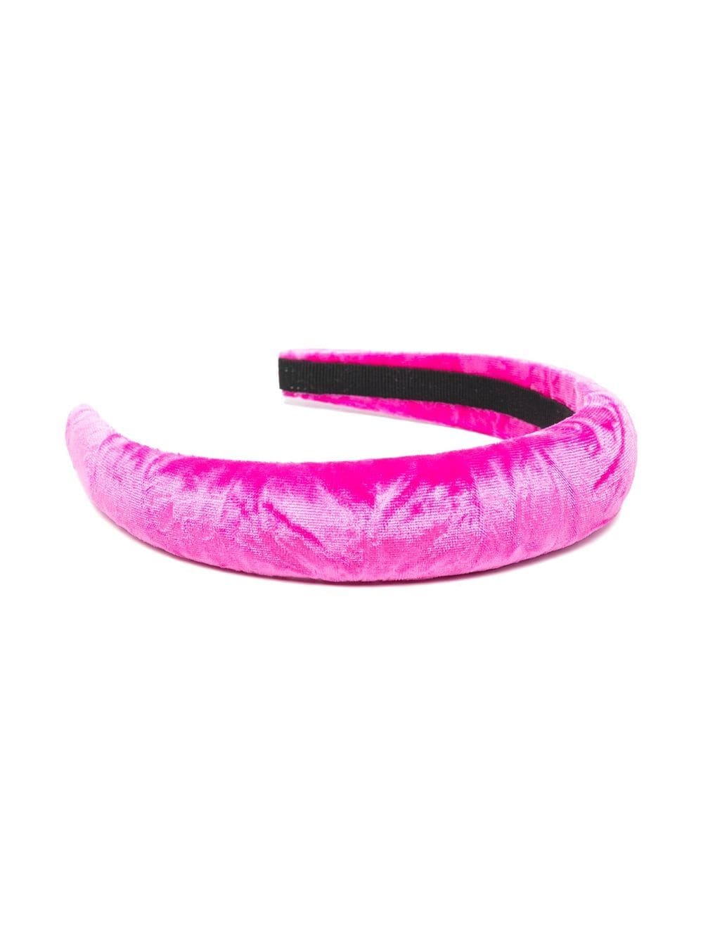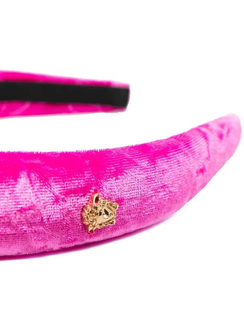 Bentita roz din catifea, cu forma semi-curculara si emblema Versace Medusa. 92% poliester; 8% elastan.