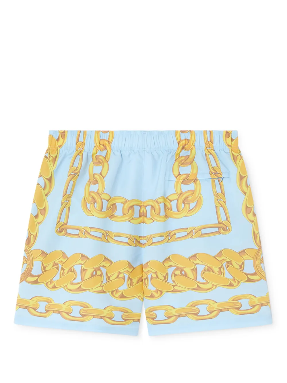 Bermude Versace Medusa Chains Swim multicolor, din poliester, cu talie elastica si snur, buzunare laterale, buzunar cu fermoar la spate, inchidere cu snur, grafica Medusa Chain Link in tesatura si tiv drept. Potriviti pentru sezonul primavara/vara. 100% textil.