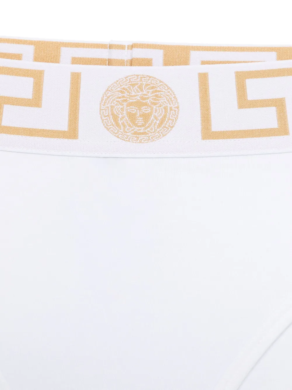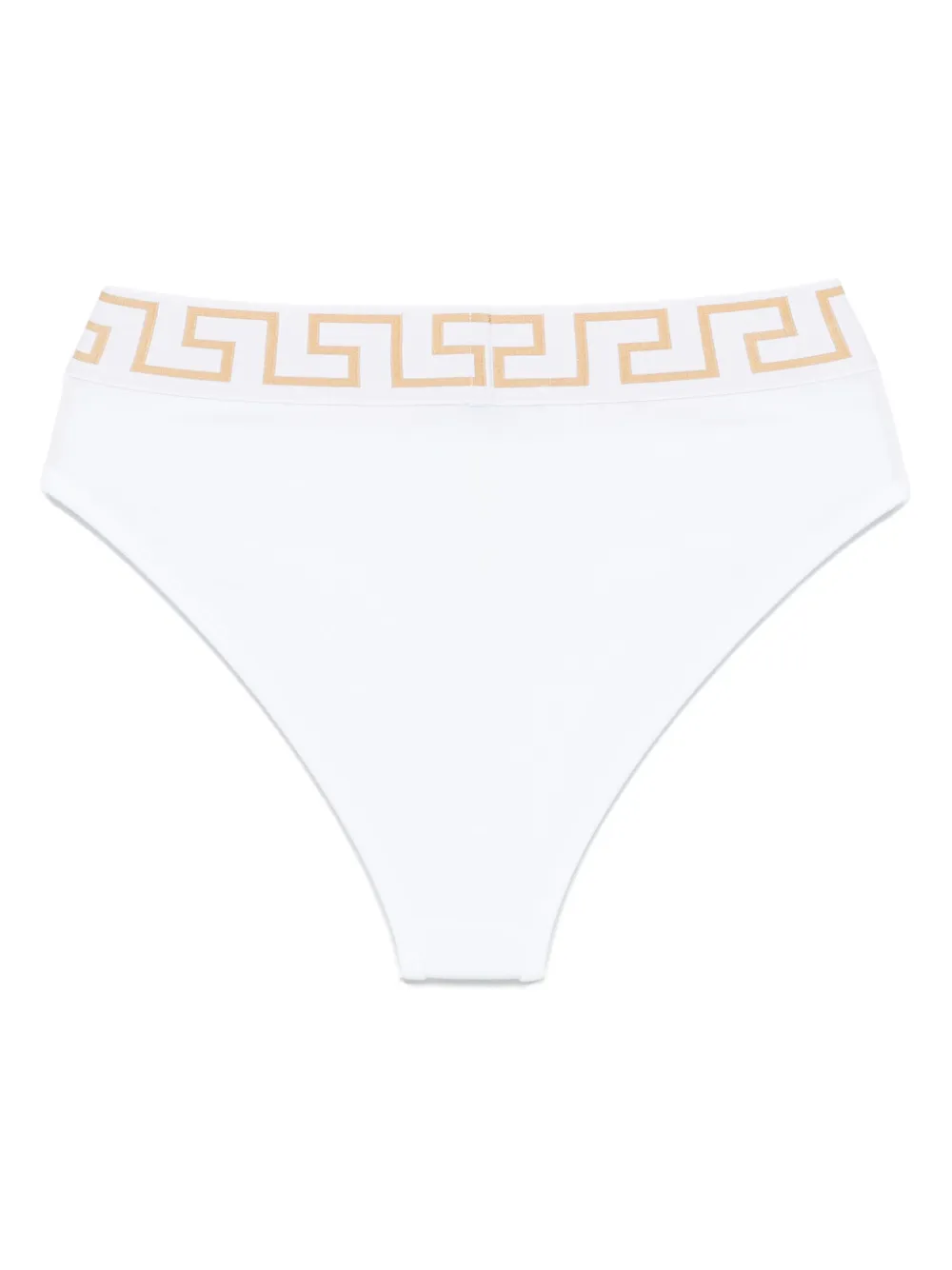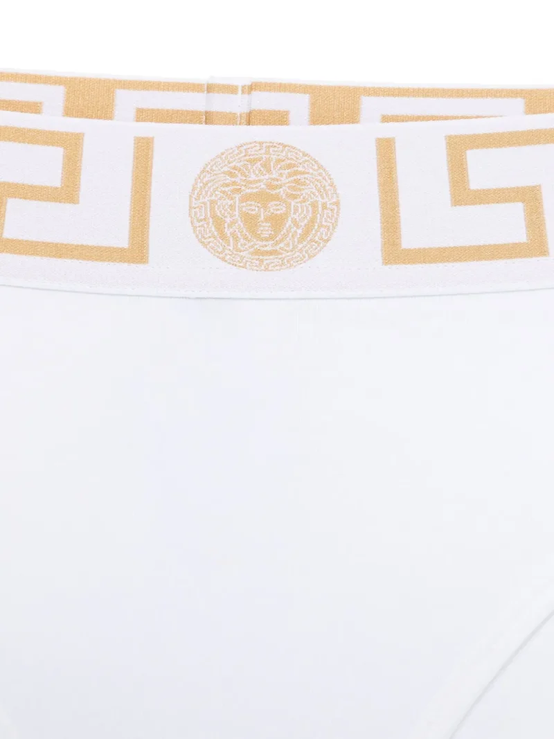Bikini Versace Greca Border Briefs alb, din bumbac organica, cu talie elastica si logo Greca in tesatura. 94% bumbac; 6% elastan; 94% bumbac; 6% elastan.