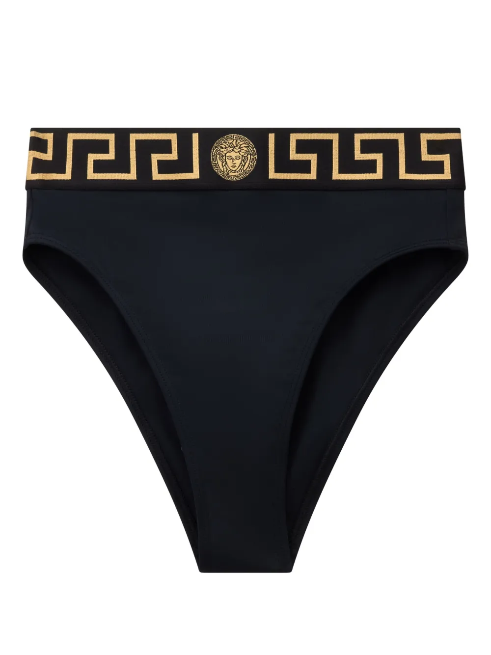 Bikini Versace Greca Border High-Waist negru, cu talie inalta, decorati cu banda elastica Versace Greca si Medusa Head. 78% nylon; 22% elastan. Aveti grija sa probati costumele de baie deasupra propriilor articole de imbracaminte.