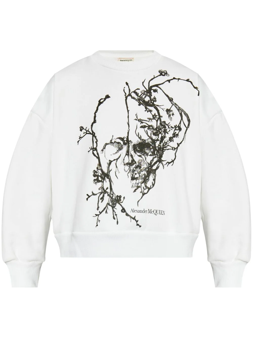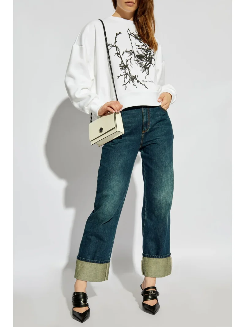 Bluza alba din bumbac, cu guler rotund, maneci lungi, umeri cazuti, mansete elastice, grafica si logo Alexander McQueen imprimate pe partea din fata, logo interior si tiv elastic drept. Potrivita pentru sezonul toamna/iarna. 100% bumbac.