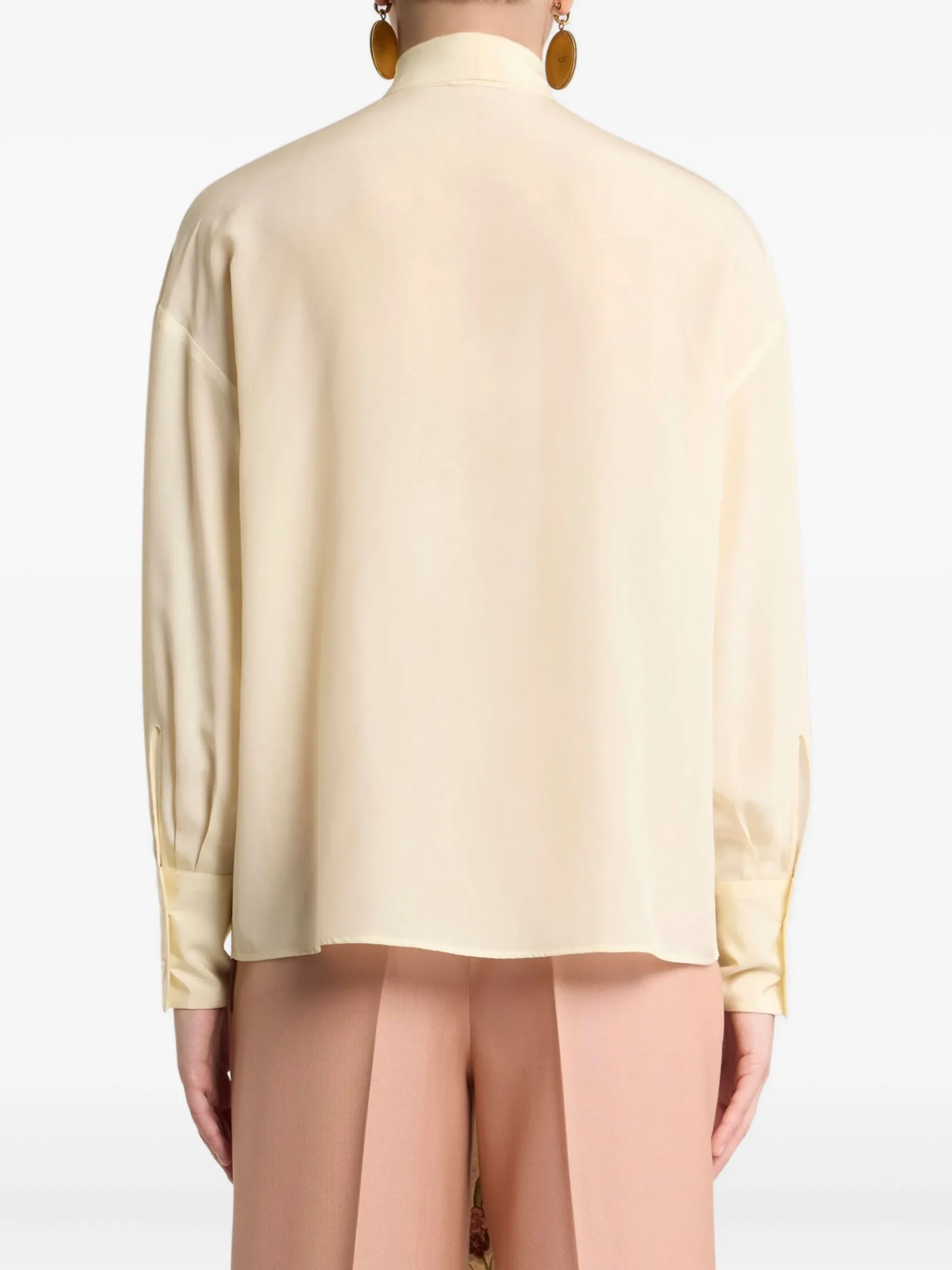 Bluza ETRO floral-print bej deschis din matase premium, funda decorativa pe partea din fata, maneci lungi, mansete cu nasturi, imprimeu floral.100% matase
