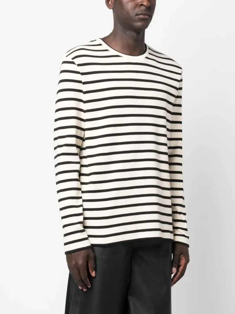 Bluza alb/negru din bumbac, cu guler rotund, maneci lungi, grafica in dungi Jil Sander pe toata suprafata produsului, eticheta cu logo cusuta la spate, captuseala din bumbac si tiv drept. Potrivita pentru sezonul toamna/iarna. 100% bumbac; 100% bumbac.