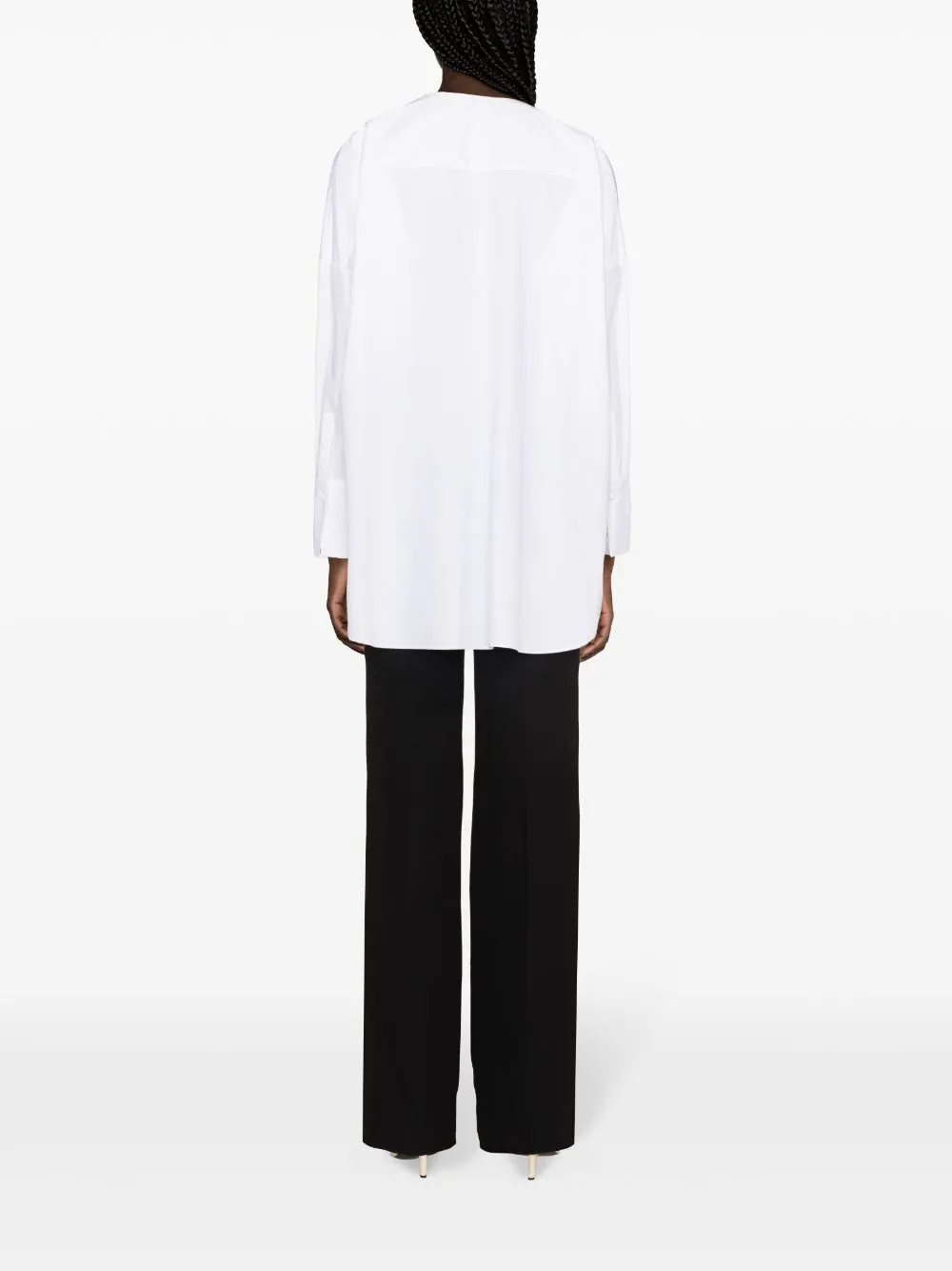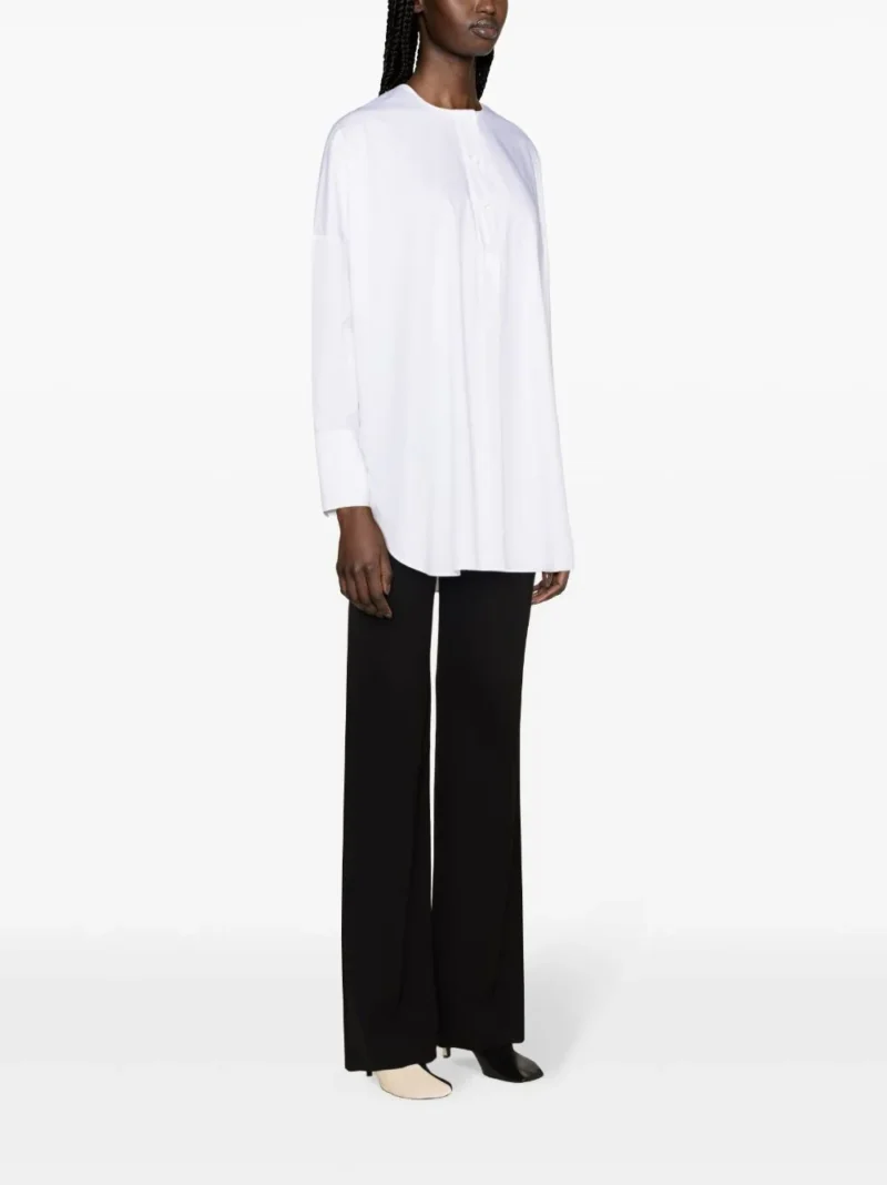Bluza alba din bumbac organic, cu guler rotund, inchidere partiala cu nasturi, maneci lungi, mansete cu nasturi si tiv curbat. Potrivita pentru sezonul primavara/vara. 100% bumbac organic.