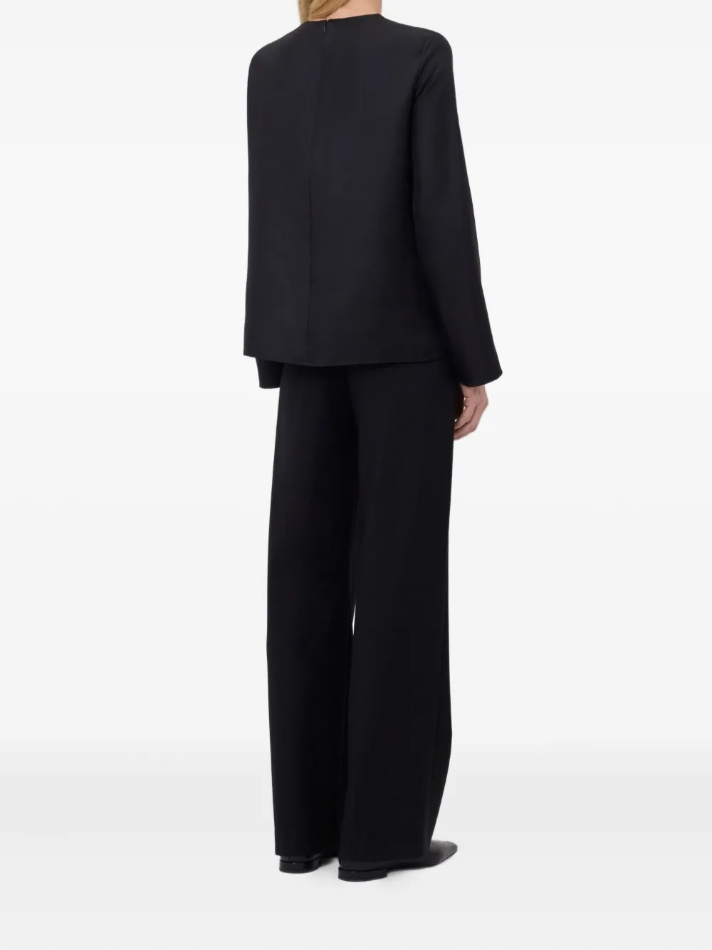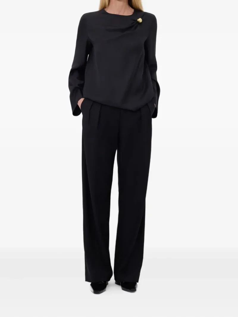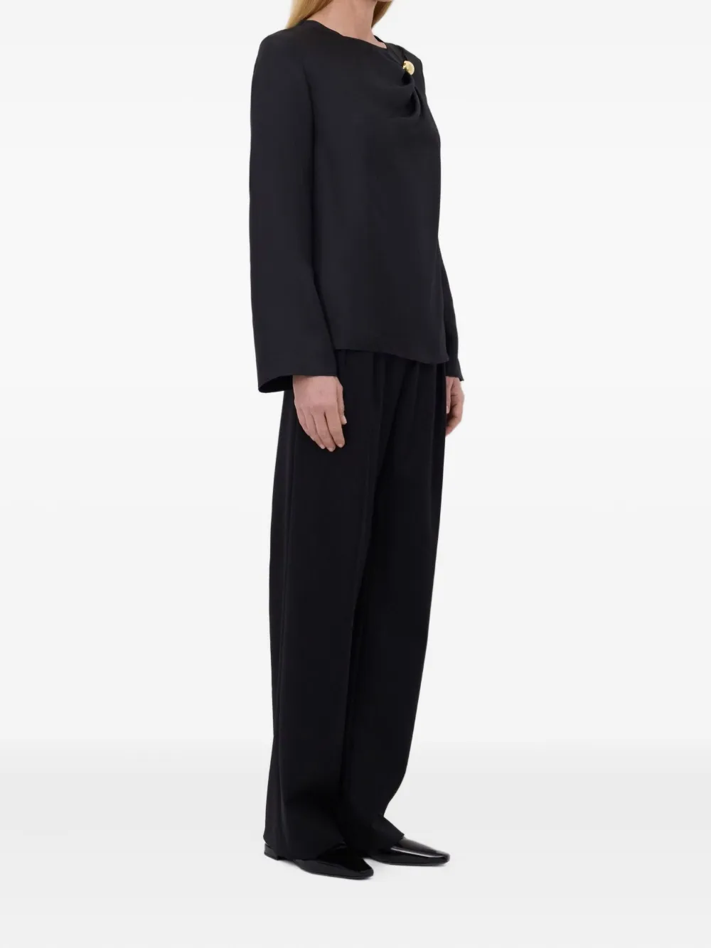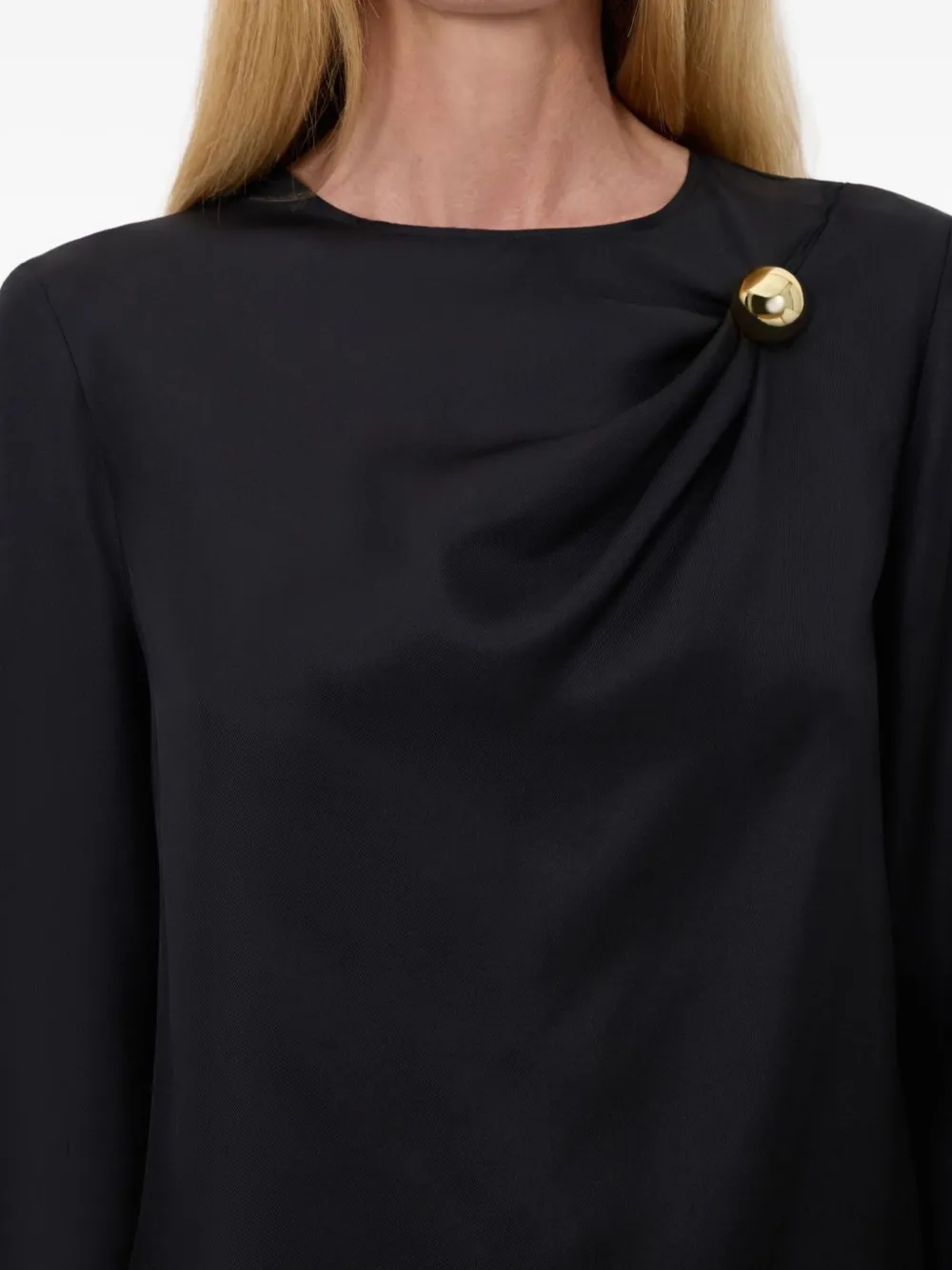 Bluza LouLou de Saison Draped Ornament-Detail negru, realizata din matase, cu guler rotund, maneci lungi, inchidere cu fermoar la spate, decorata cu drapaj, accesoriu auriu si tiv drept. Potrivita pentru sezonul toamna/iarna. 100% matase.