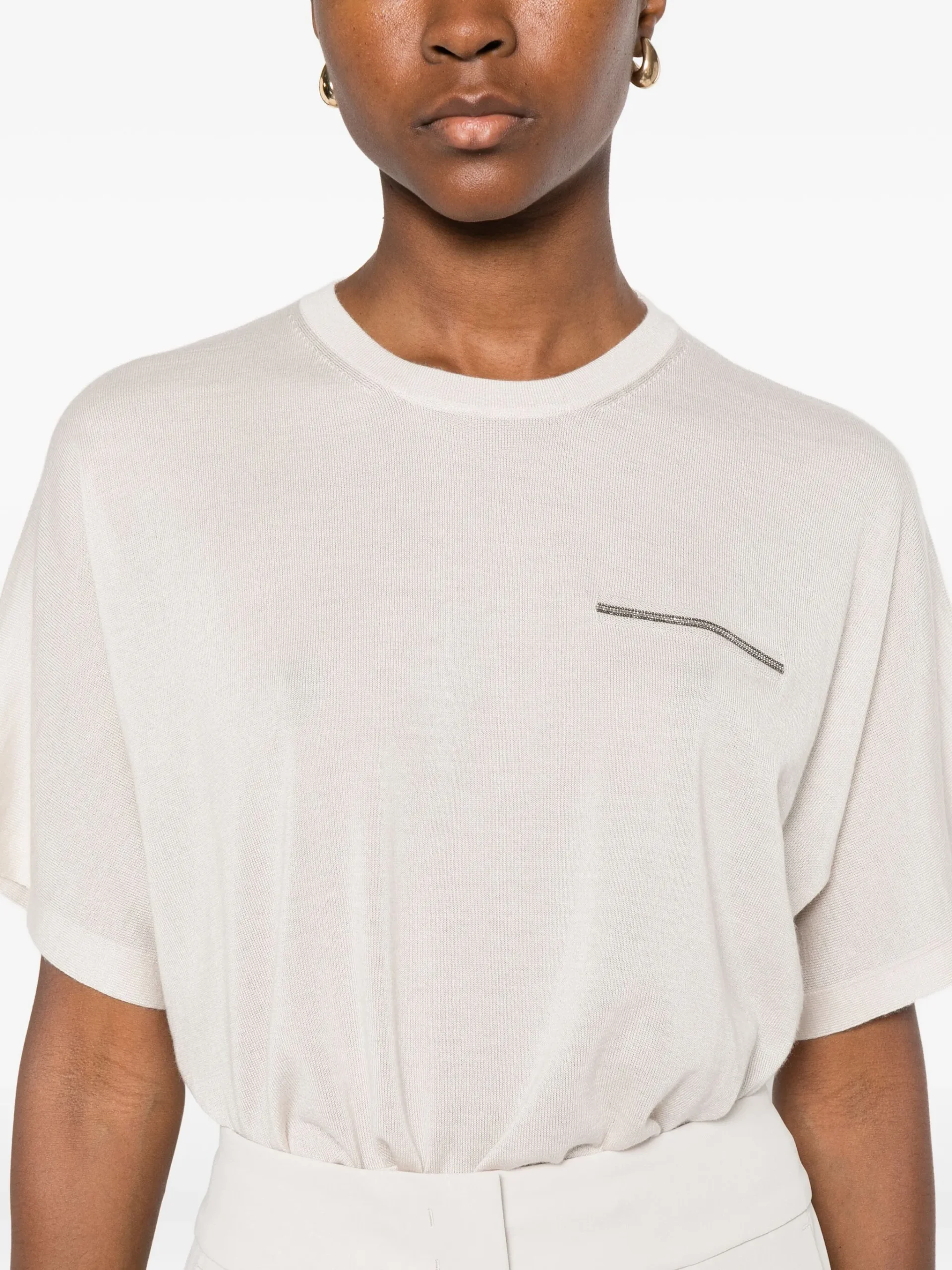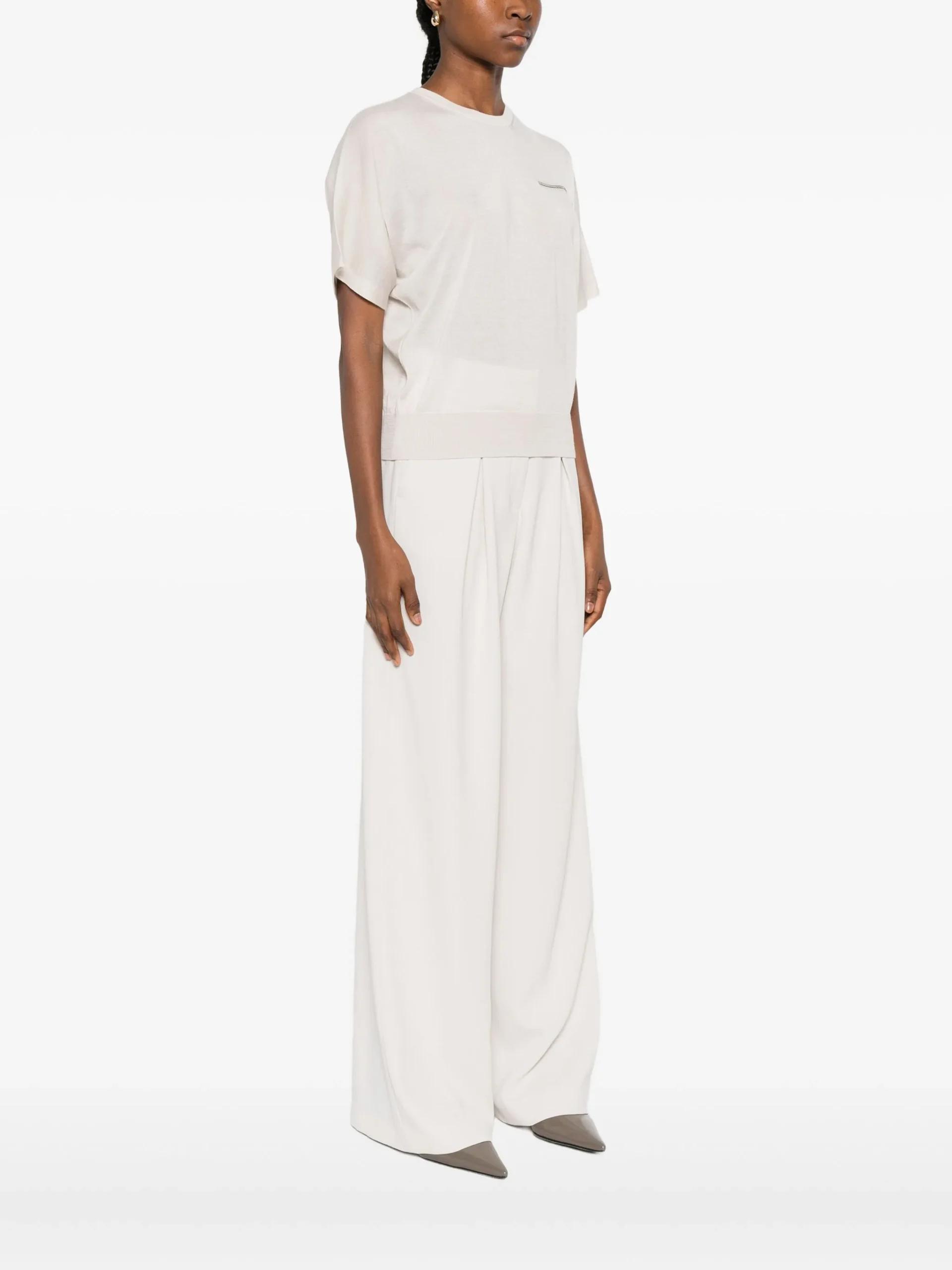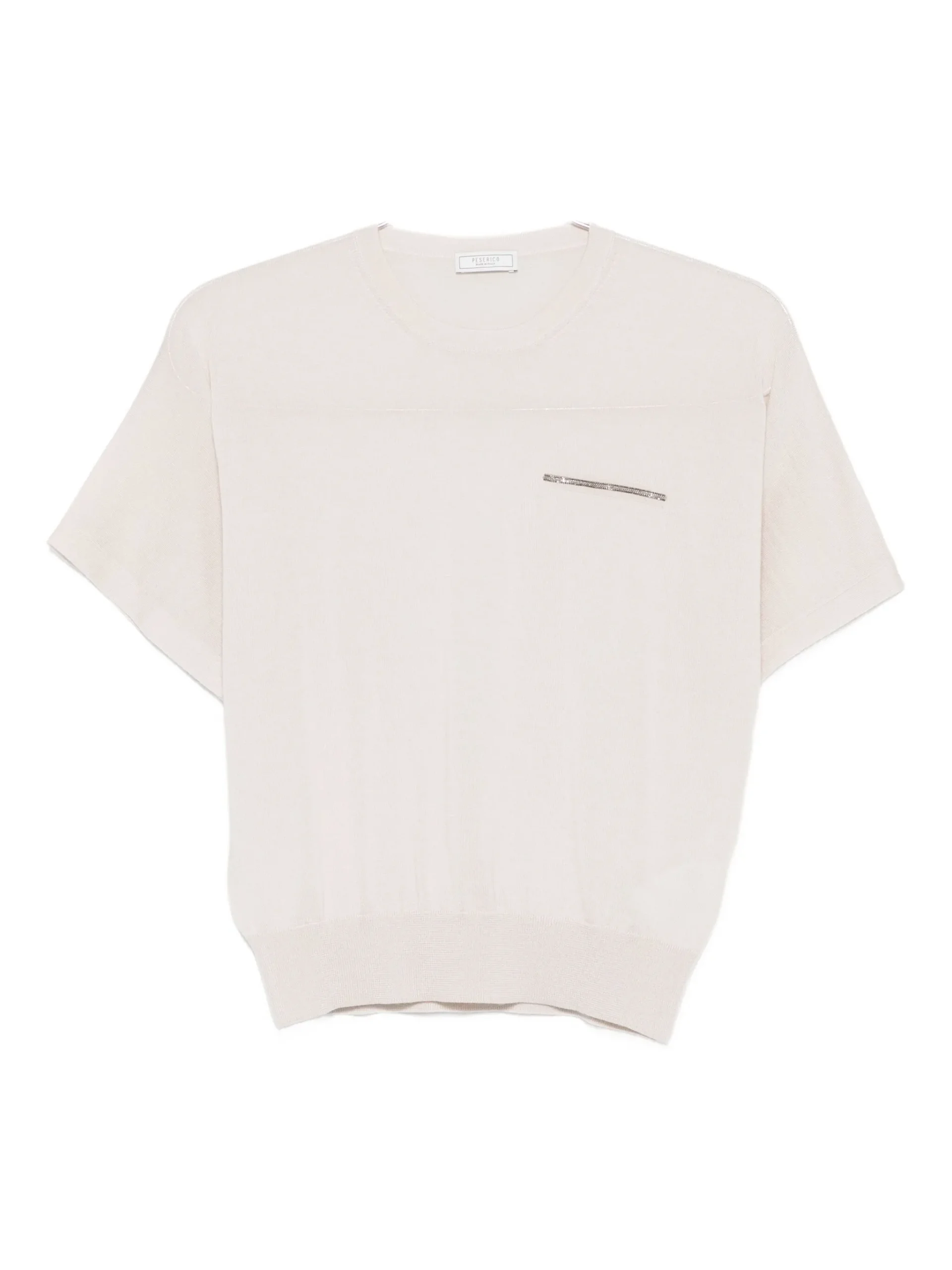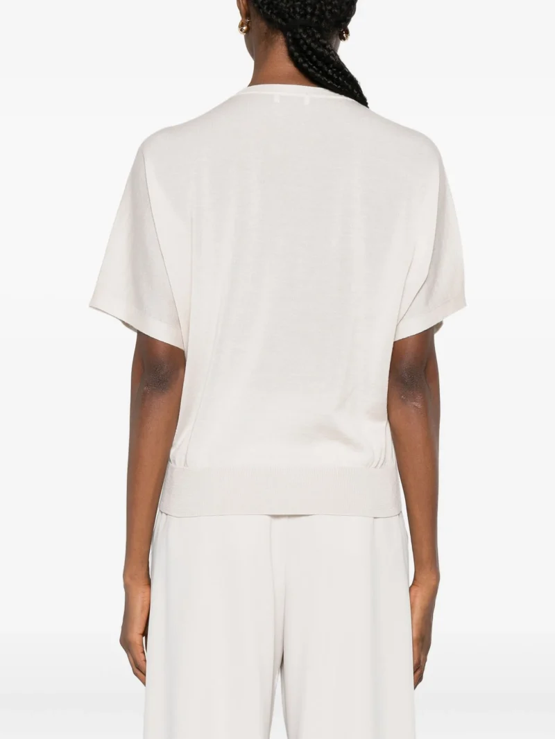 Bluza Peserico fine-knit short-sleeve bej din amestec de casmir premium si matase, maneci scurte, tiv drept. 70% casmir 30% matase