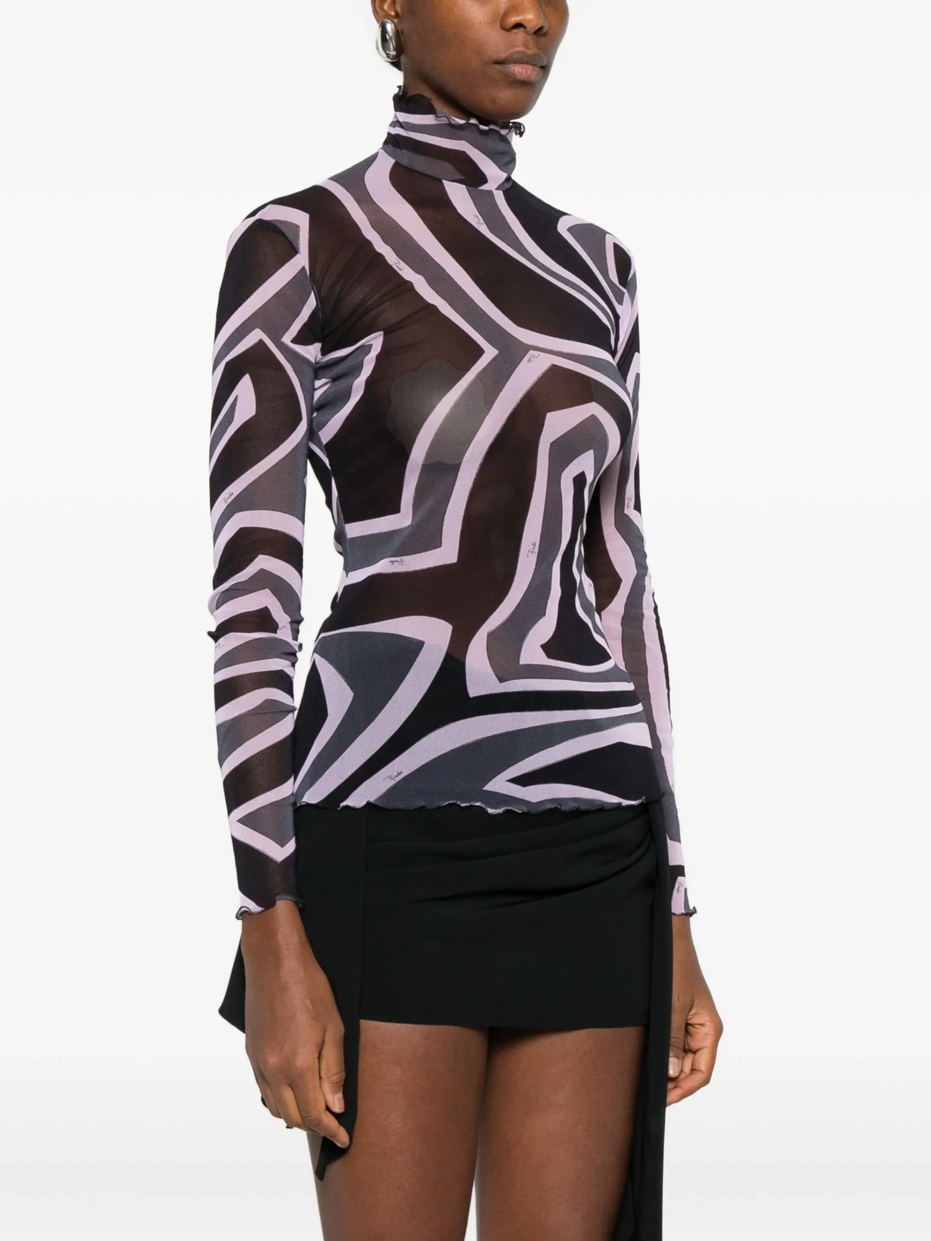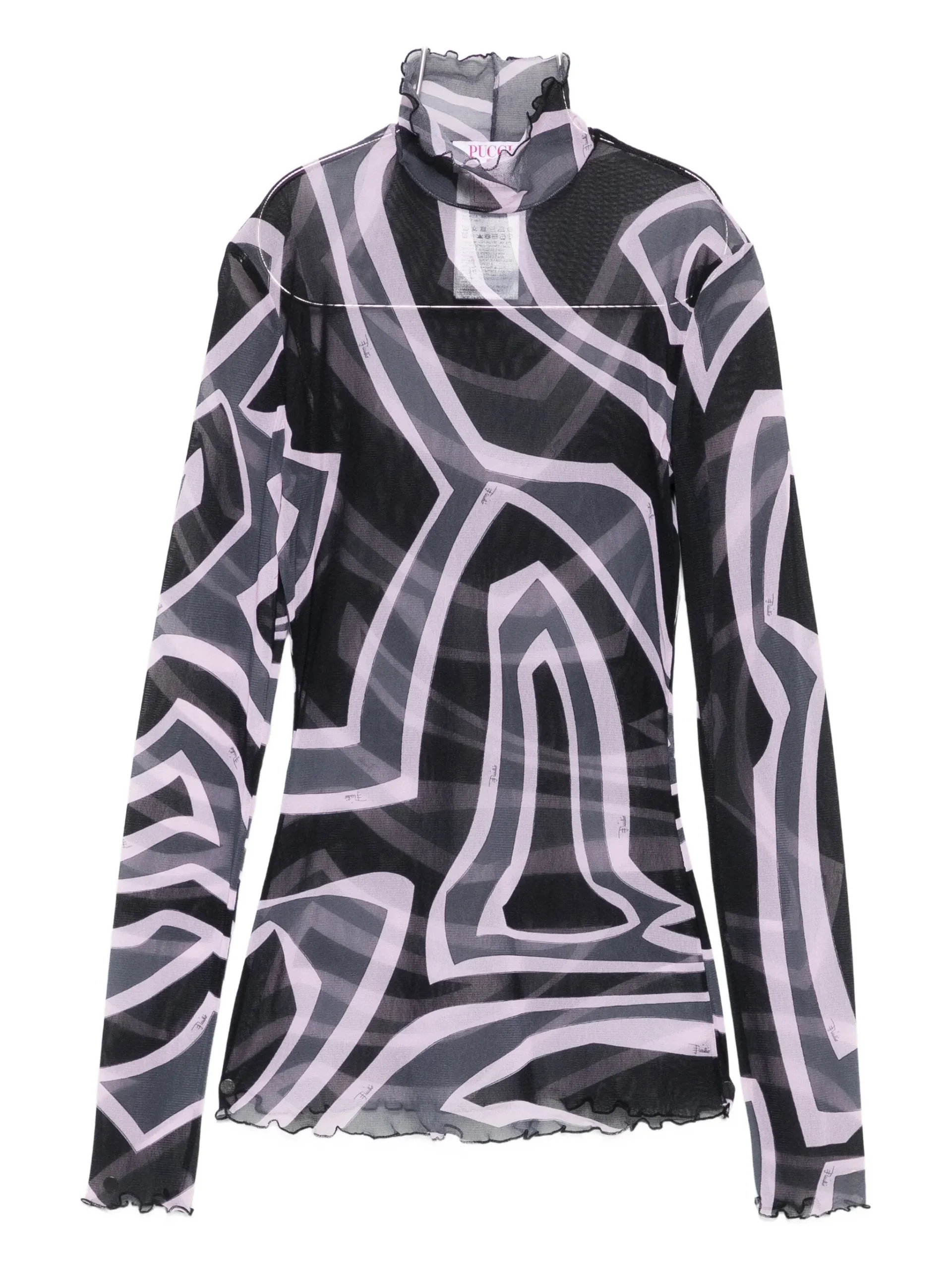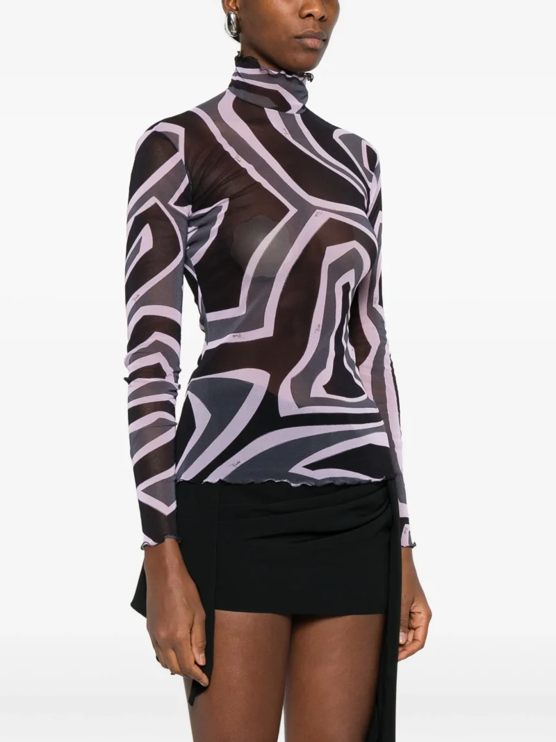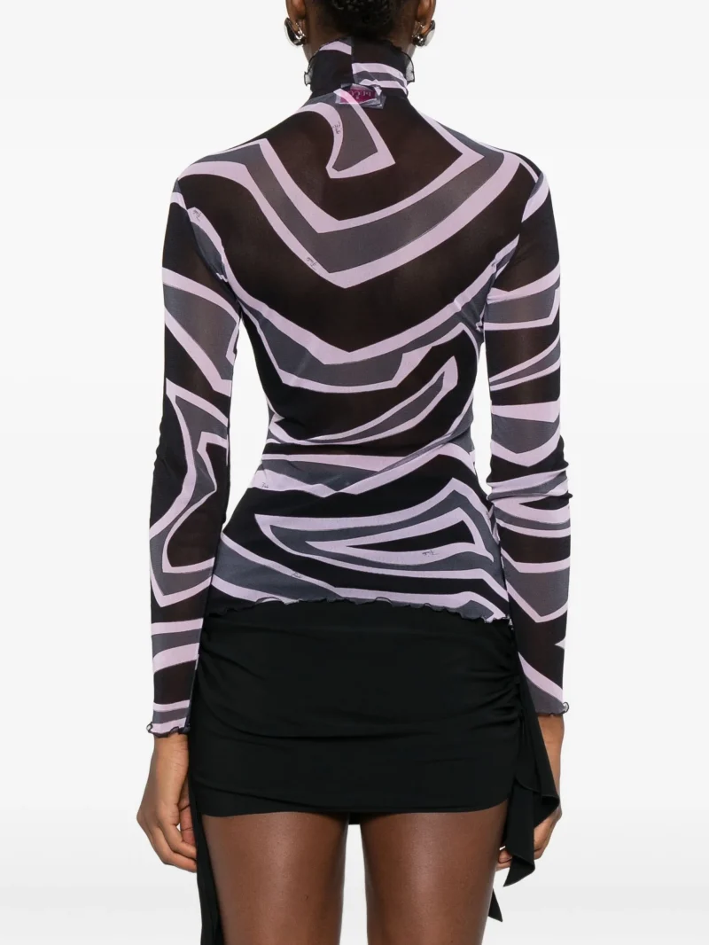Bluza PUCCI abstract-print mesh multicolor, guler inalt, imprimeu cu model abstract, maneci lungi, tiv cu volane.100% poliamida