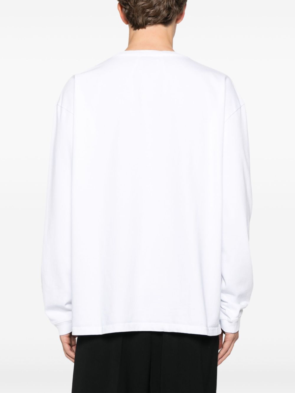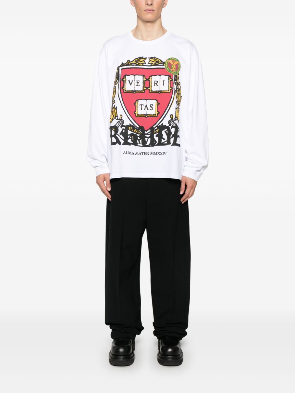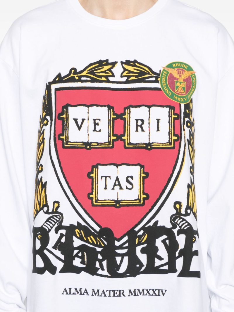 Bluza RHUDE Veritas alb, din bumbac, cu guler rotund, umeri cazuti, maneci lungi, mansete elastice, grafica Rhude Veritas imprimata pe partea din fata, logo oversized imprimat si tiv drept. Potrivita pentru sezonul toamna/iarna. 100% bumbac.