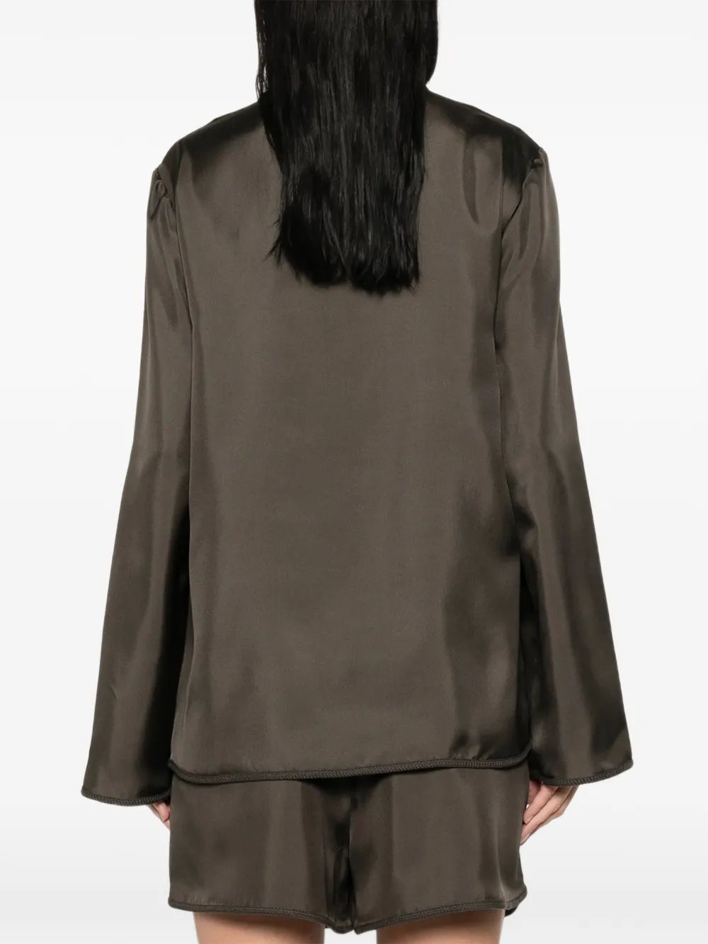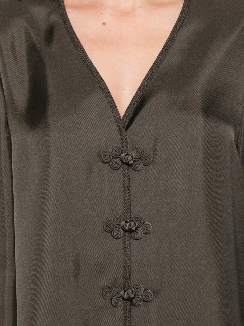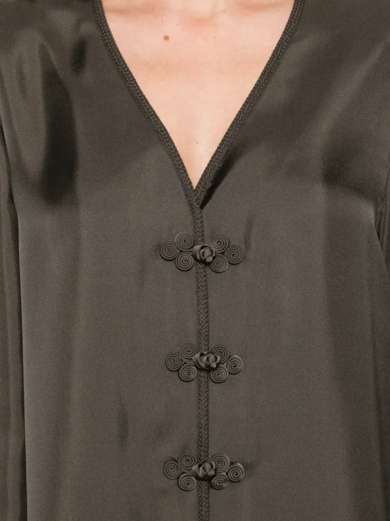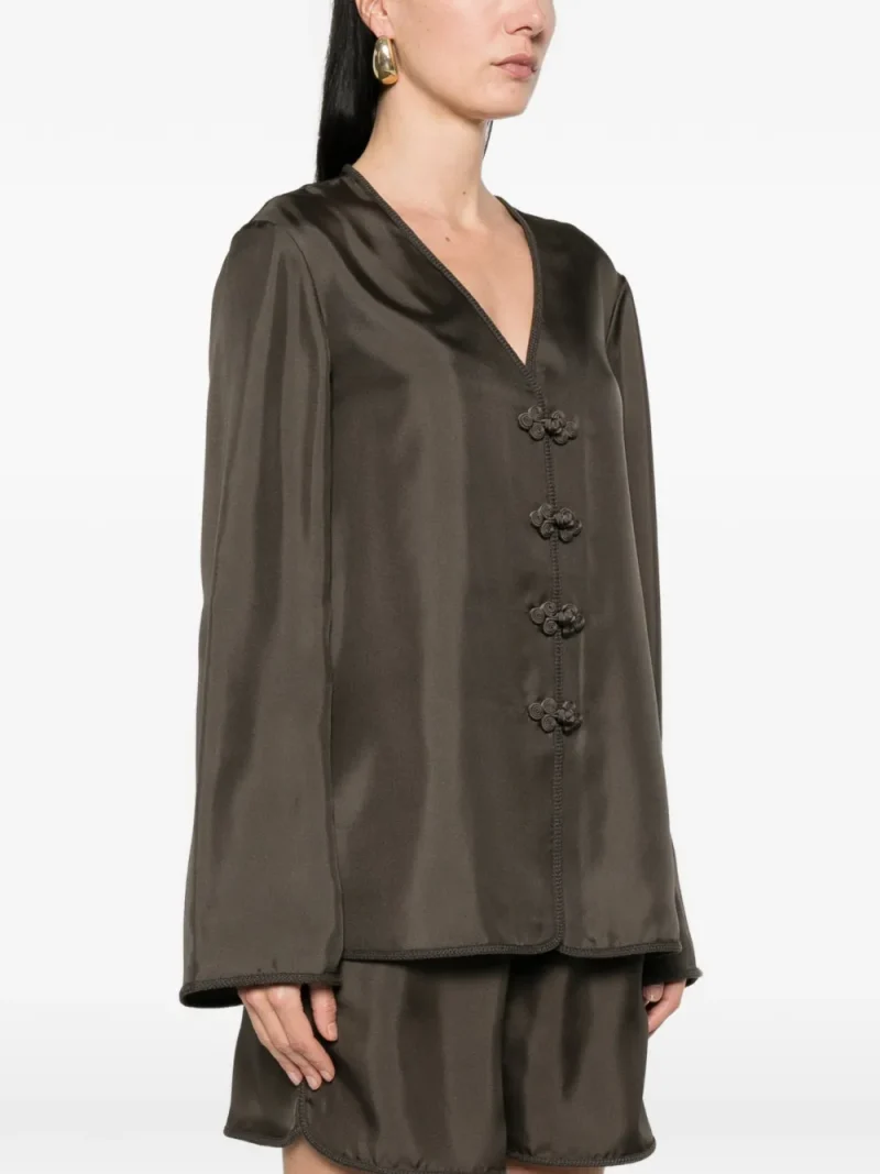 Bluza Rohe Pankou-Closure Silk maro, realizata din matase, cu decolteu in V, inchizatori pankou traditionale chinezesti, maneci lungi, aspect satinat si tiv drept. Potrivita pentru sezonul primavara/vara. 100% matase.