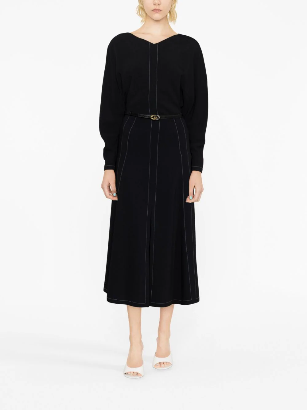 Bluza neagra din viscoza si acetat, cu guler in V, maneci lungi si tiv drept. Potrivita pentru sezonul toamna/iarna. 66% viscoza; 30% acetat; 4% elastan.