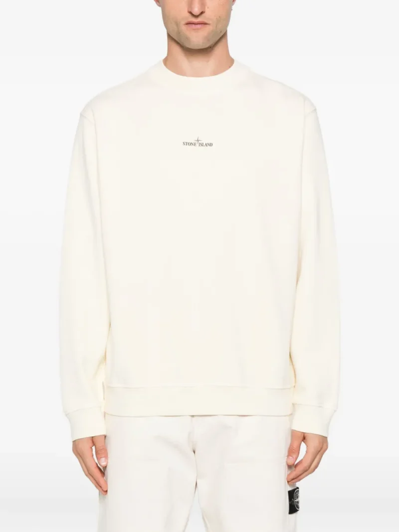 Bluza Stone Island Logo-Print bej, din bumbac, cu guler crewneck, maneci lungi, mansete elastice, logo Stone Island si Compass Badge imprimate si tiv drept. Potrivit pentru sezonul toana/iarna. 100% bumbac.