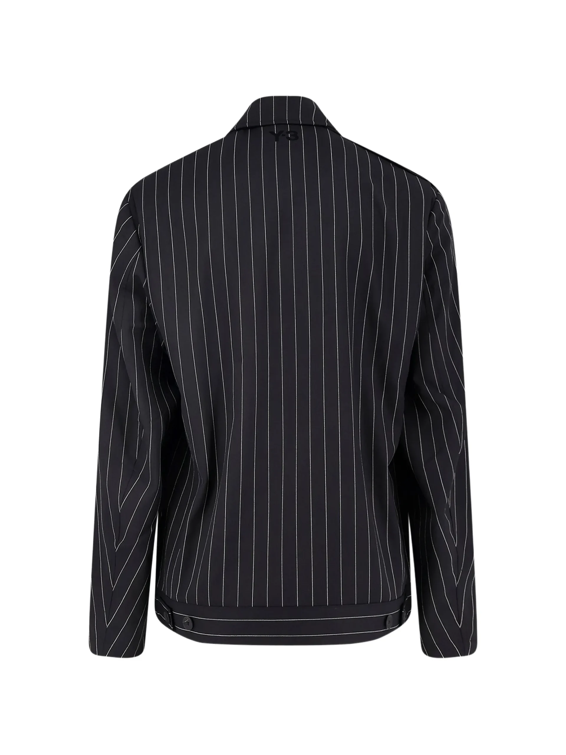 Bluza Y-3 pinstripe zip-up neagra, cu model in dungi fine, guler ascutit, inchidere cu fermoar, maneci lungi si tiv drept. 65% poliester 30% lana 5% elastan