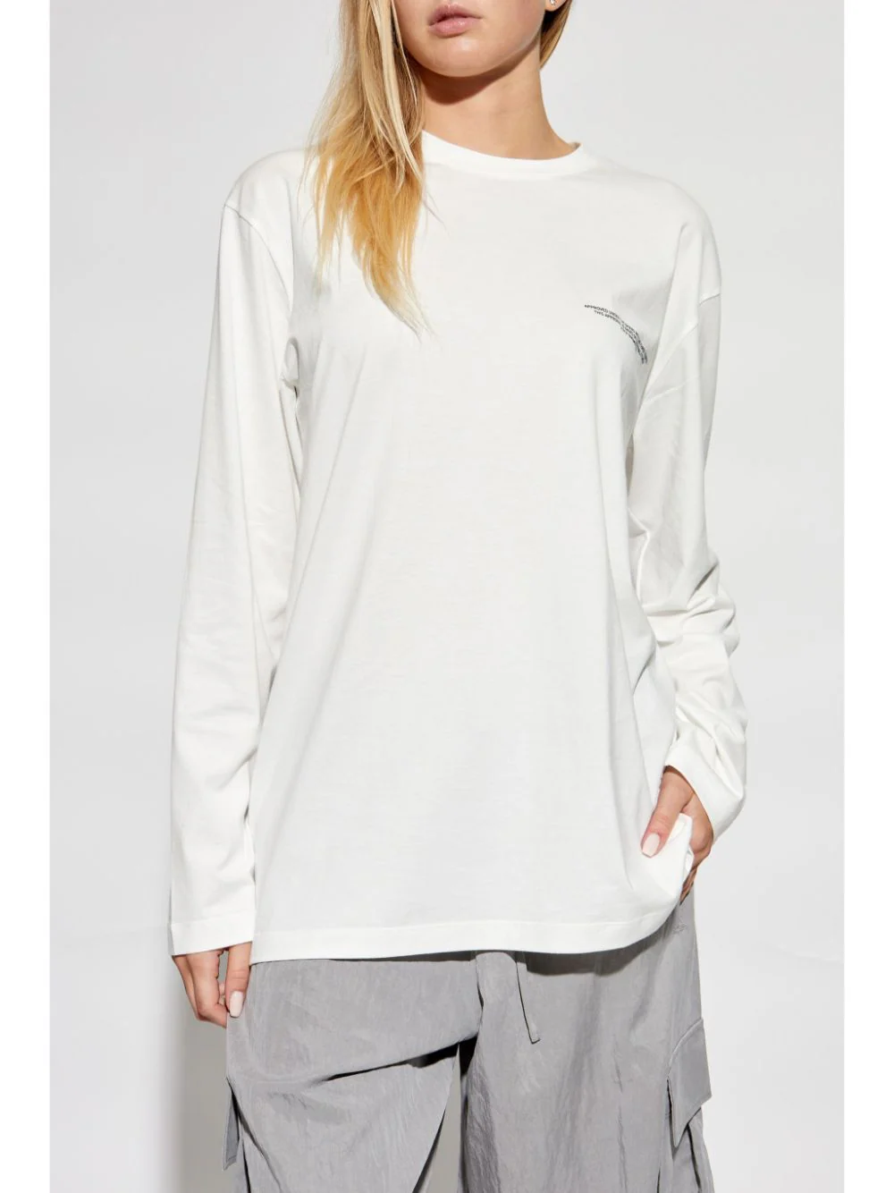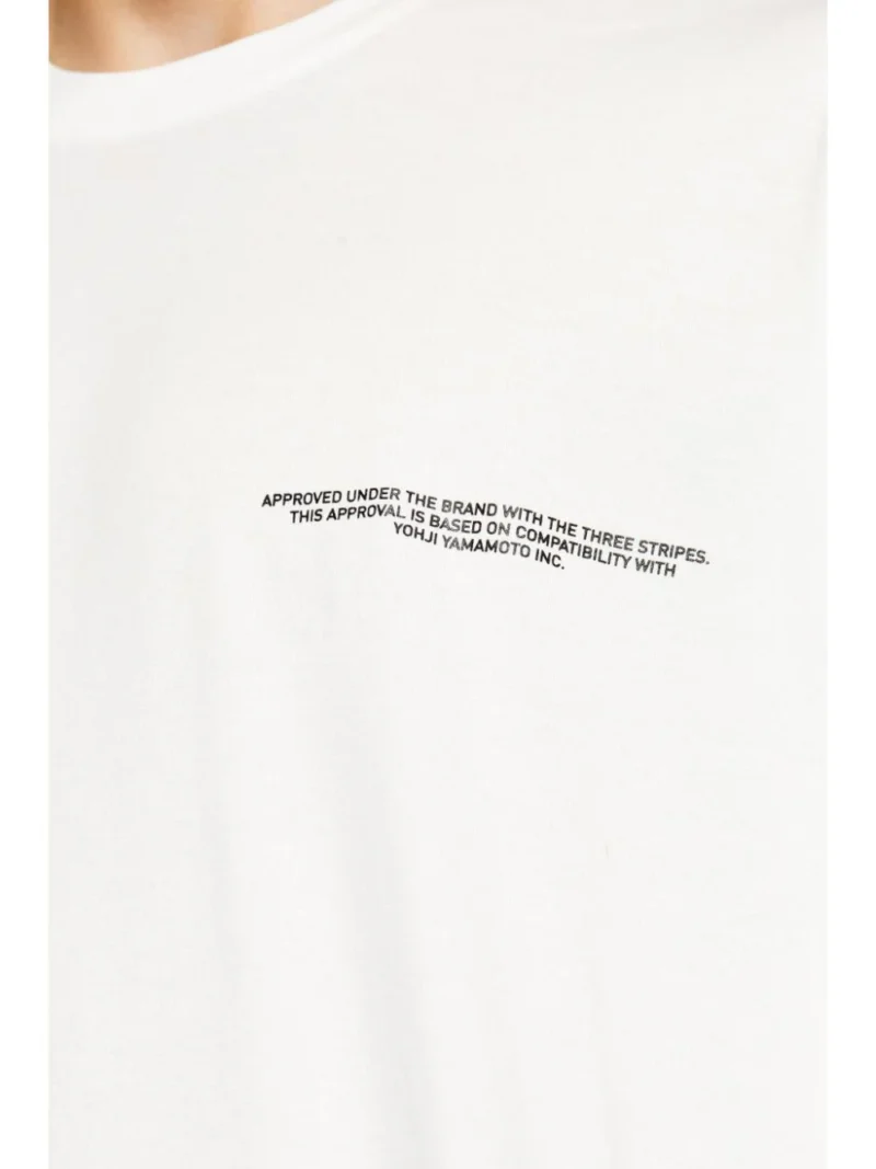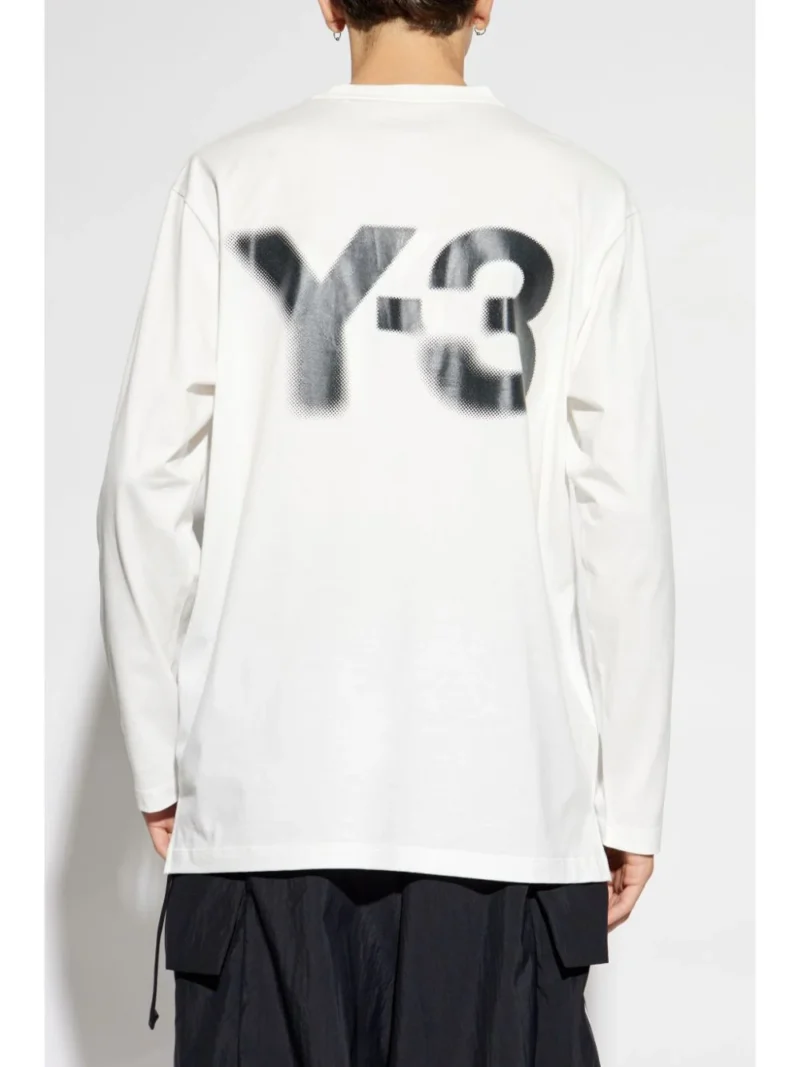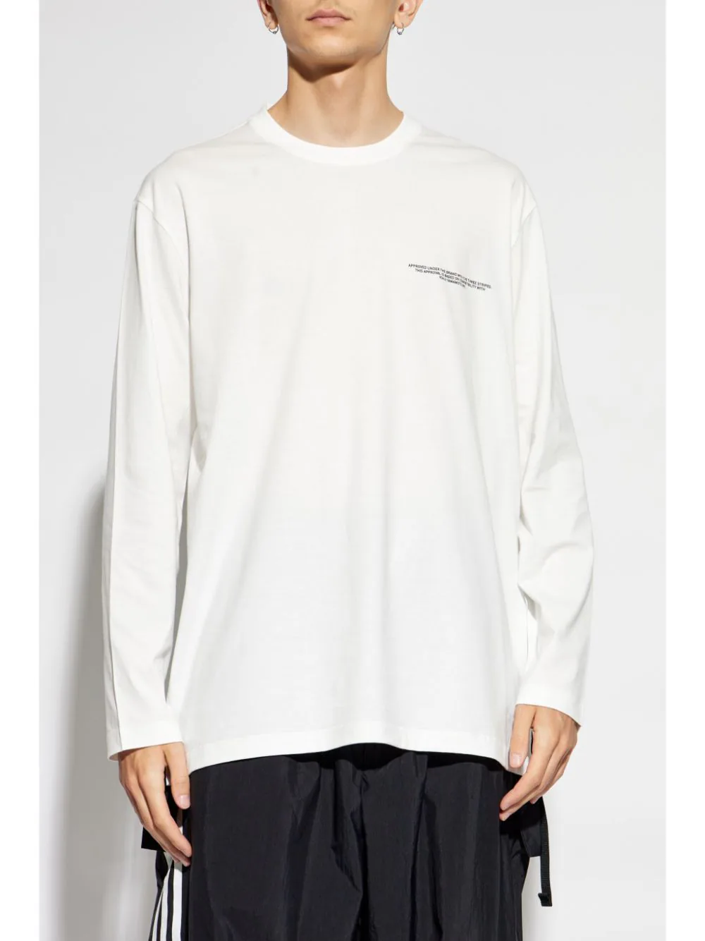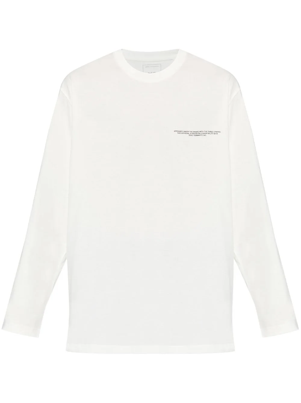 Bluza Y-3 x Adidas Logo-Print alb, din bumbac, cu guler tip crew neck, maneci lungi, umeri cazuti, text Y-3 x Adidas imprimat pe lateral, logo supradimensionat pe spate si tiv drept. Potrrivita pentru sezonul toamna/iarna. 100% bumbac.