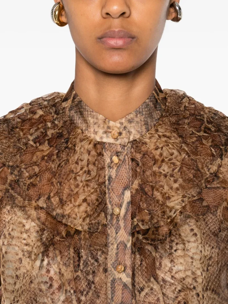 Bluza Zimmermann Ruffle-Trimmed Silk maro, design semitransparent din matase, cu guler tunica si volan decorativ, inchidere cu nasturi, maneci lungi bufante cu mansete late, grafica snake imprimata si tiv drept. Potrivita pentru sezonul toamna/iarna. 100% matase.