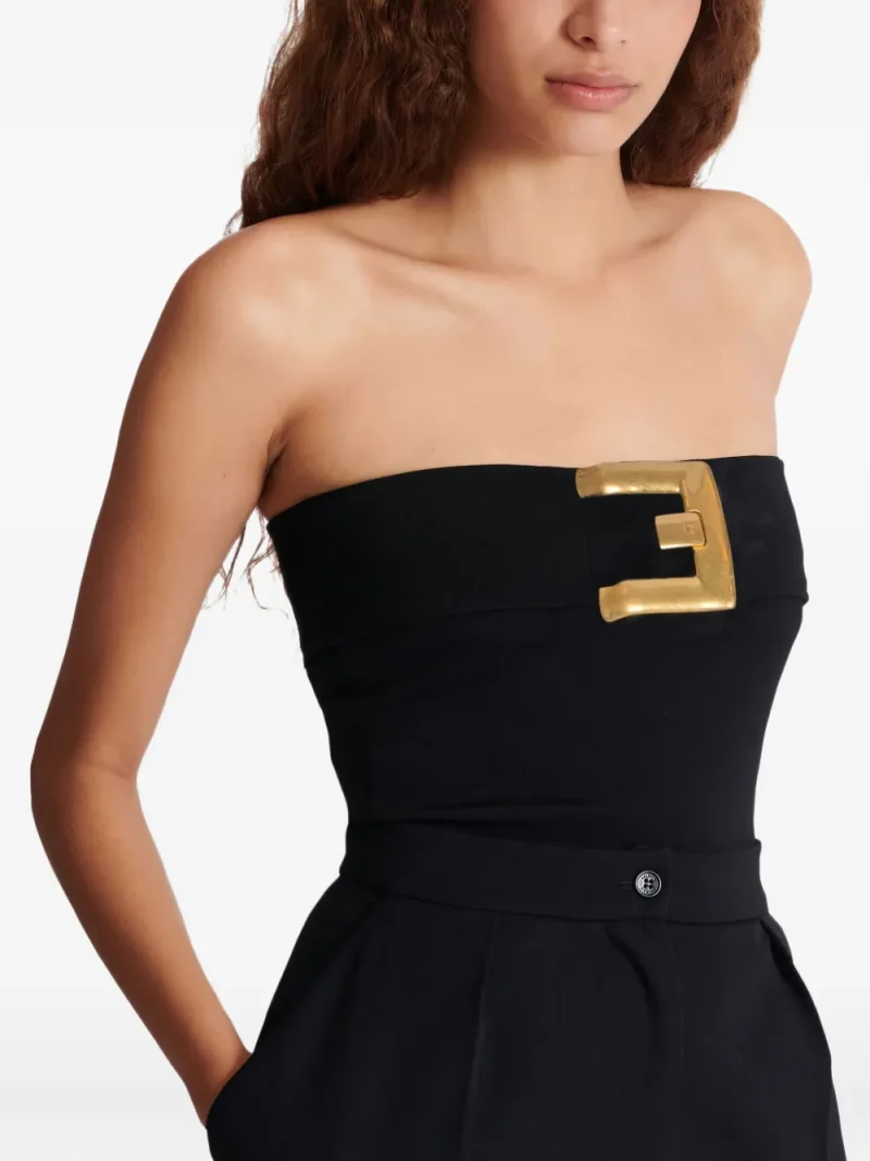 Body Balmain buckle crepe-texture negru, fara bretele, cu catarama aurie, detaliu cu nasturi, detaliu tip curea si textura crep. 80% vascoza 16% poliamida 4% elastan