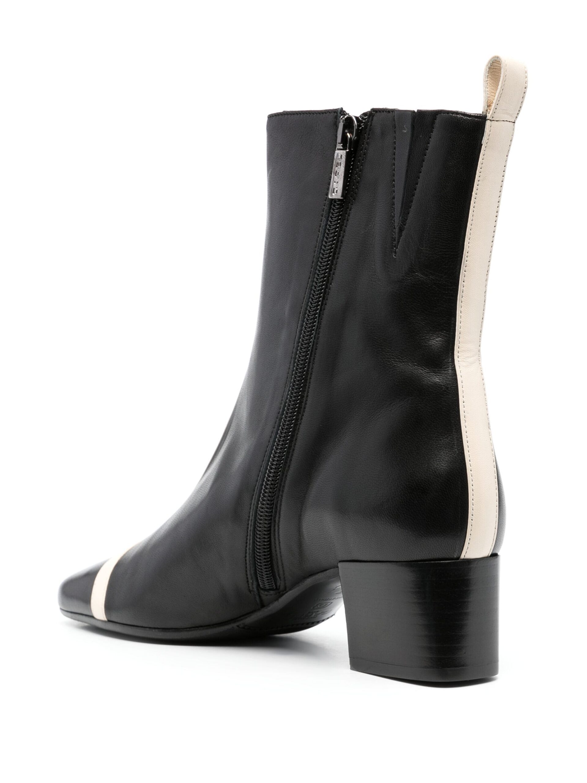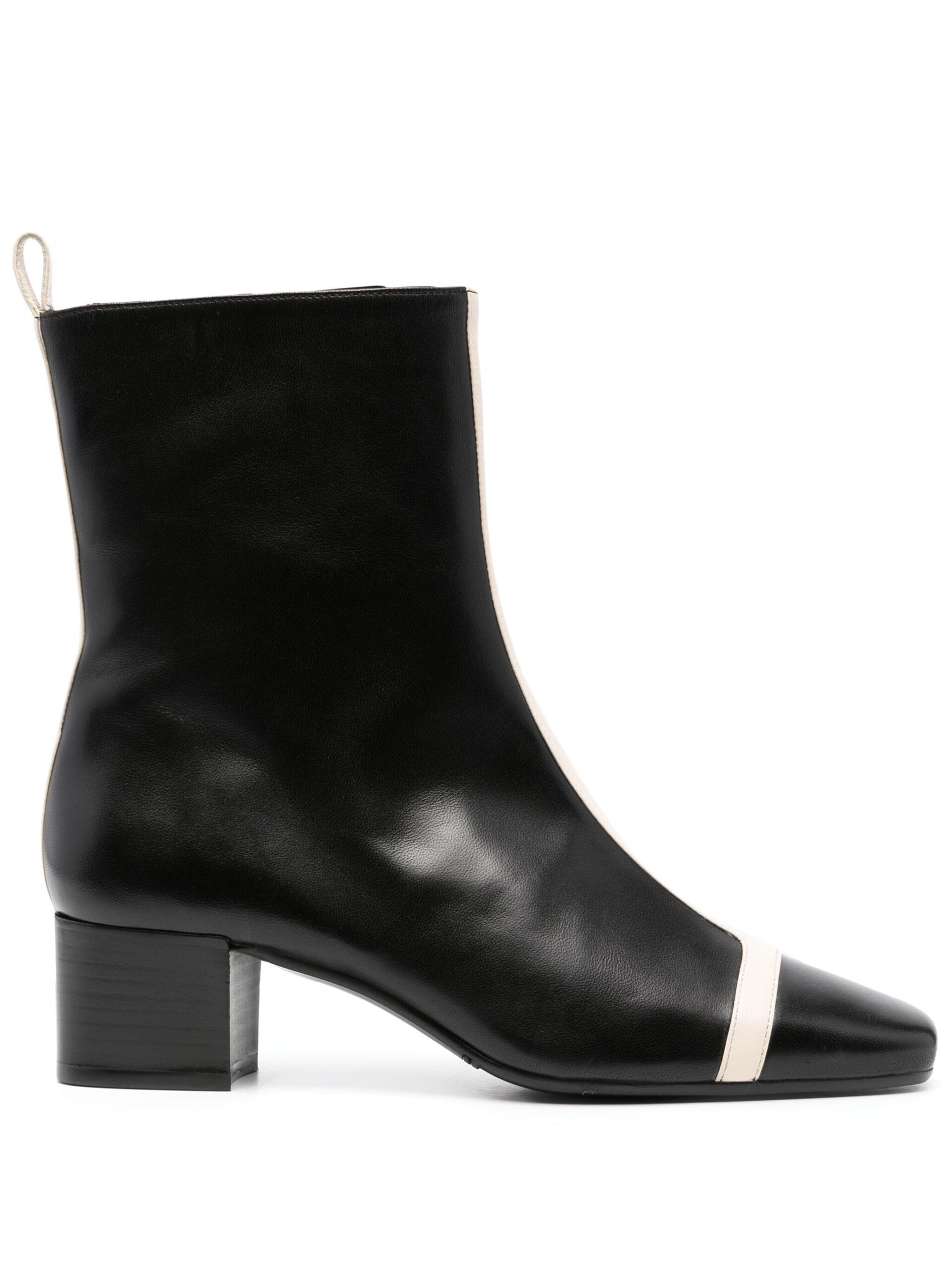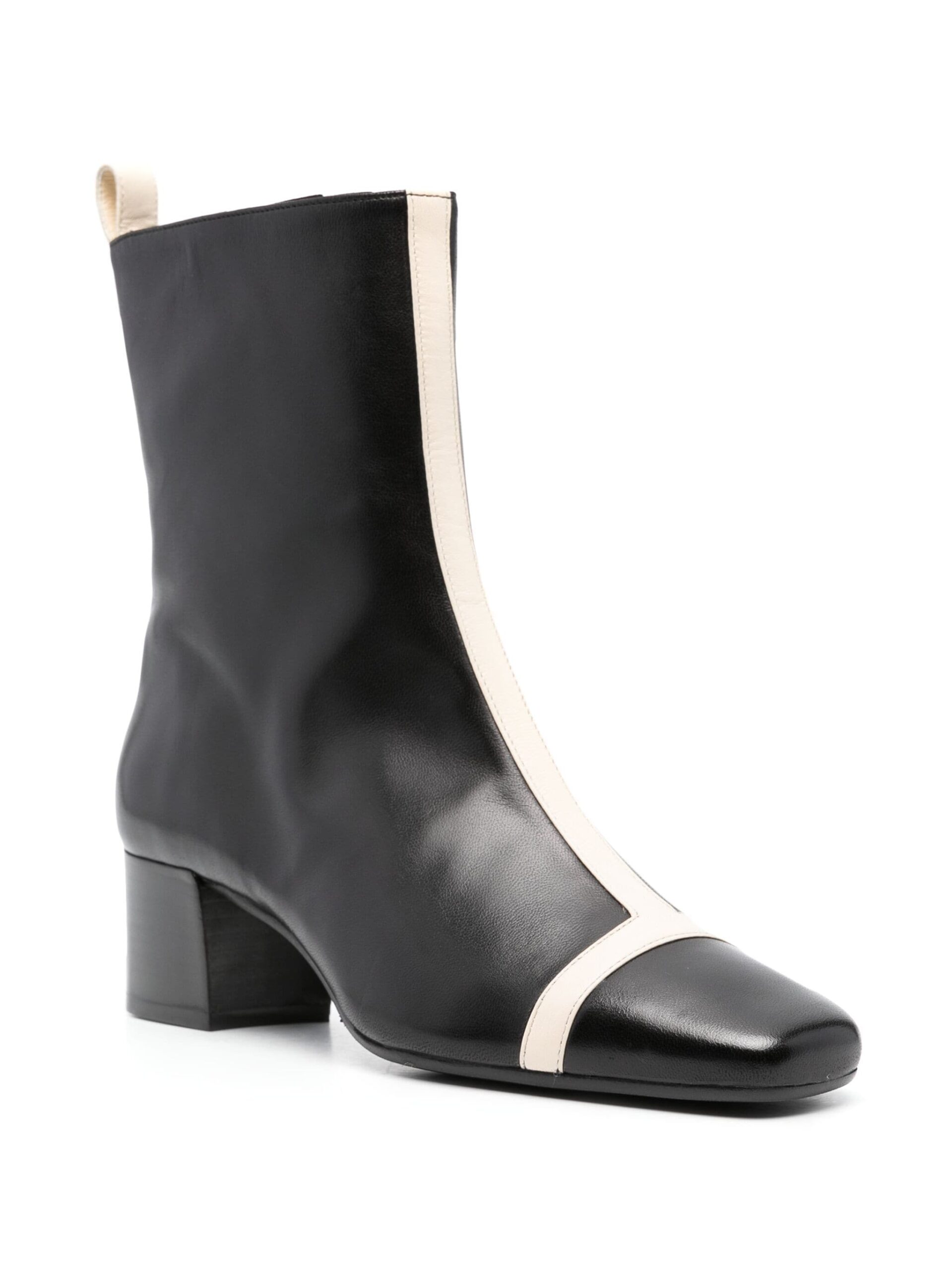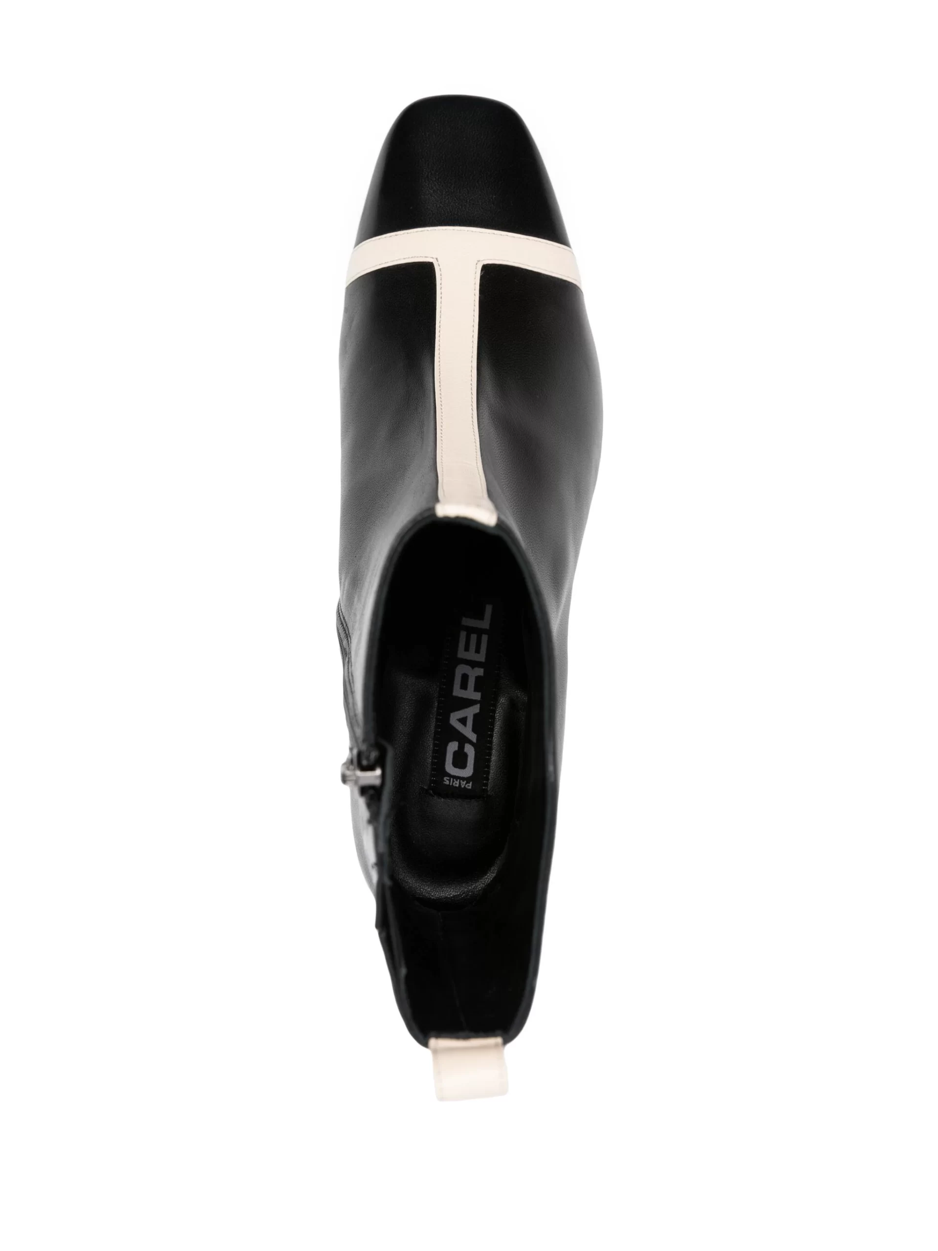 Botine negre din piele de vitel, cu profil inalt si inchidere cu fermoar pe lateral, toc de 45 mm, bot patrat, insertii din piele in contrast pe partea din fata si la spate, captuseala din piele, brant din piele si eticheta cu logo CAREL Paris cusuta la interior. Detalii: Inaltime toc- 4,5 cm; inaltime profil- 17 cm. 100% piele de vitel; 100% piele de vitel; 100% cauciuc.