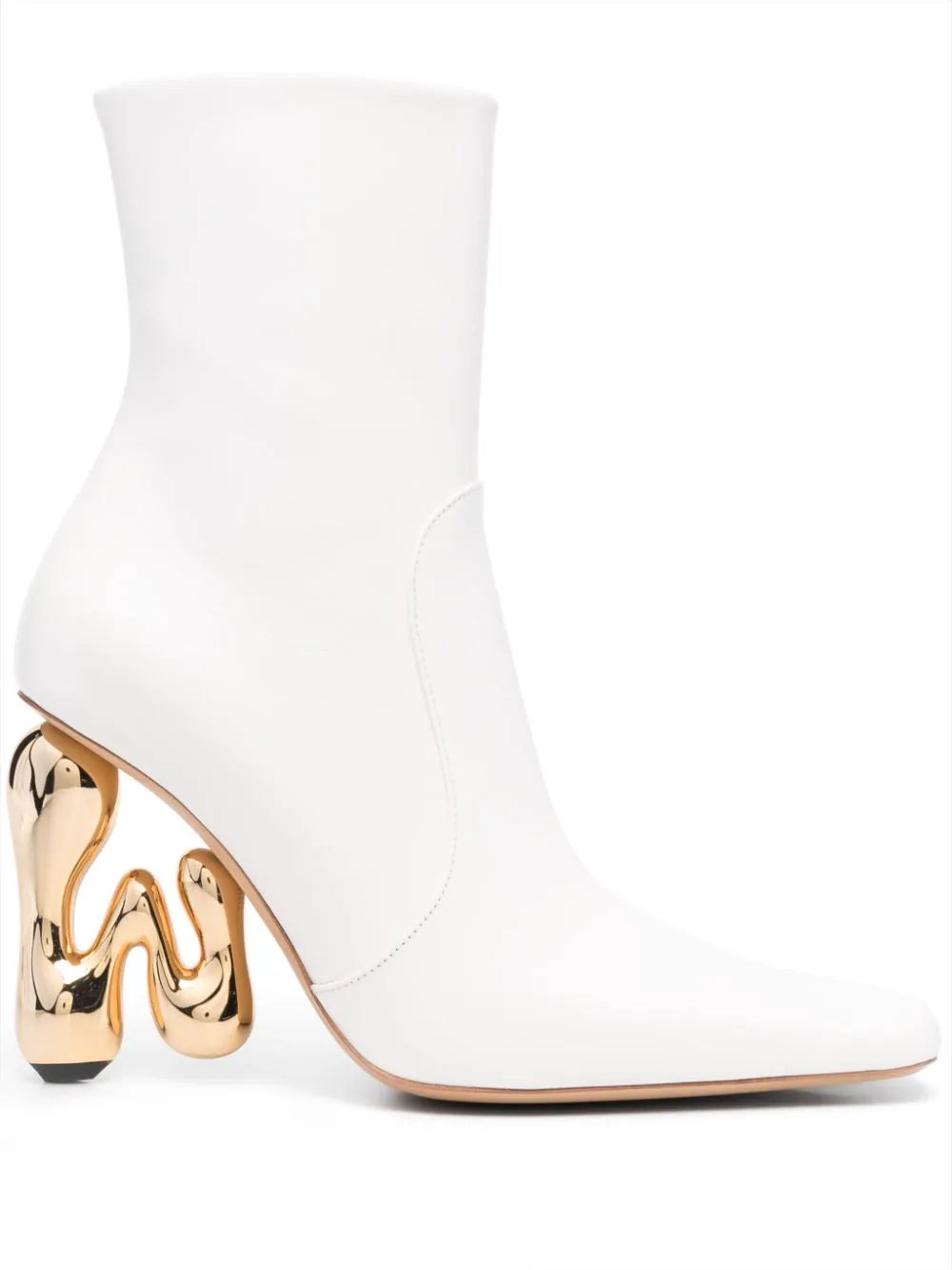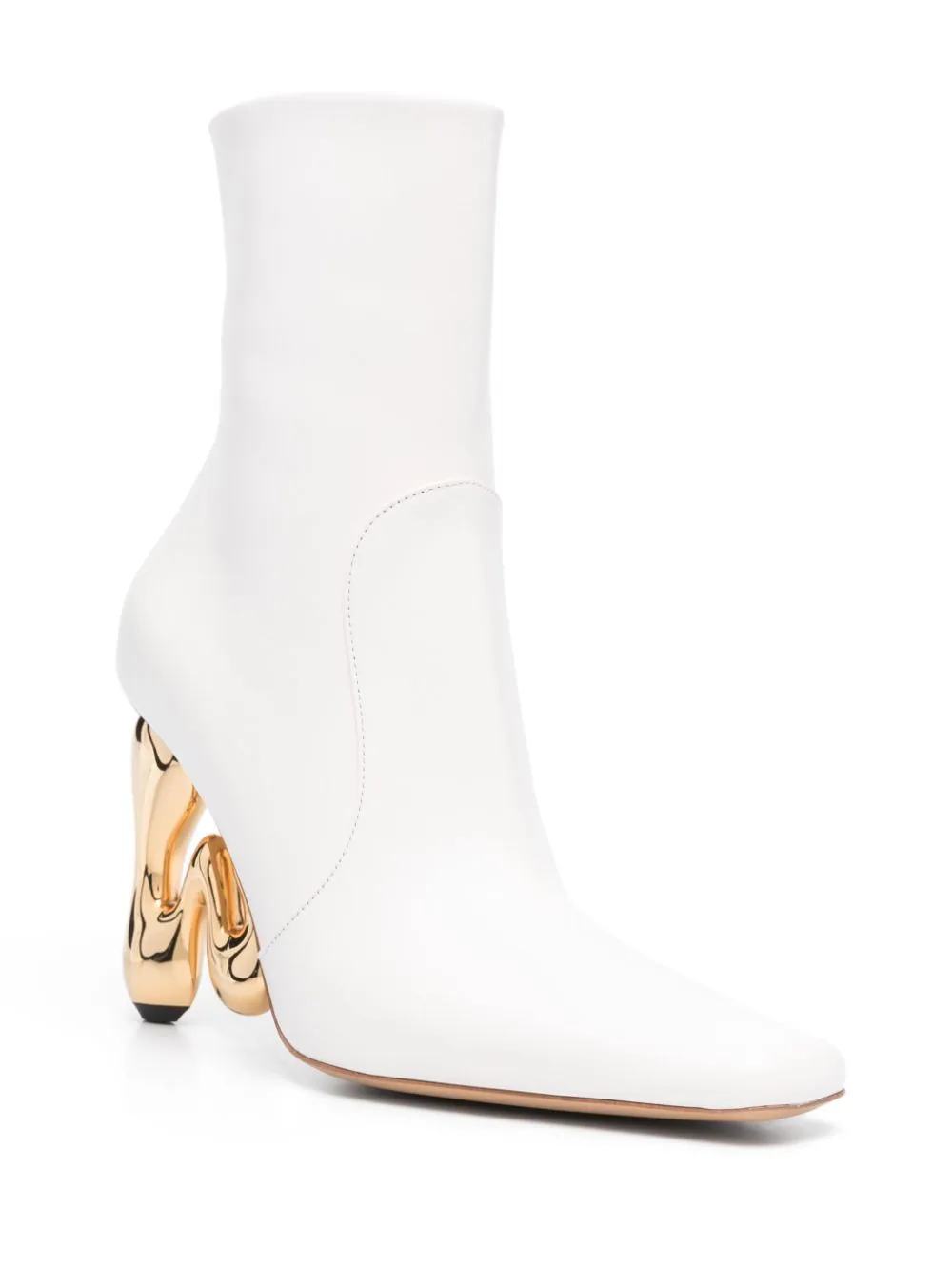 Botine albe din piele de vitel, cu profil inalt, inchidere laterala cu fermoar, captuseala din piele, bot drept, talpa inclianta din piele si toc de 12 cm. Detalii: inaltime profil- 15 cm. 100% piele de vitel; 100% piele de vitel; 100% piele de vitel.