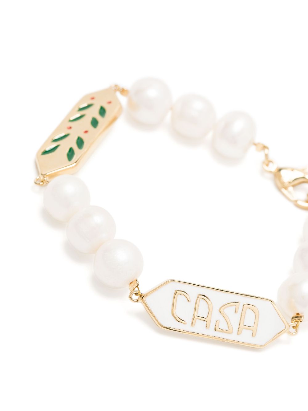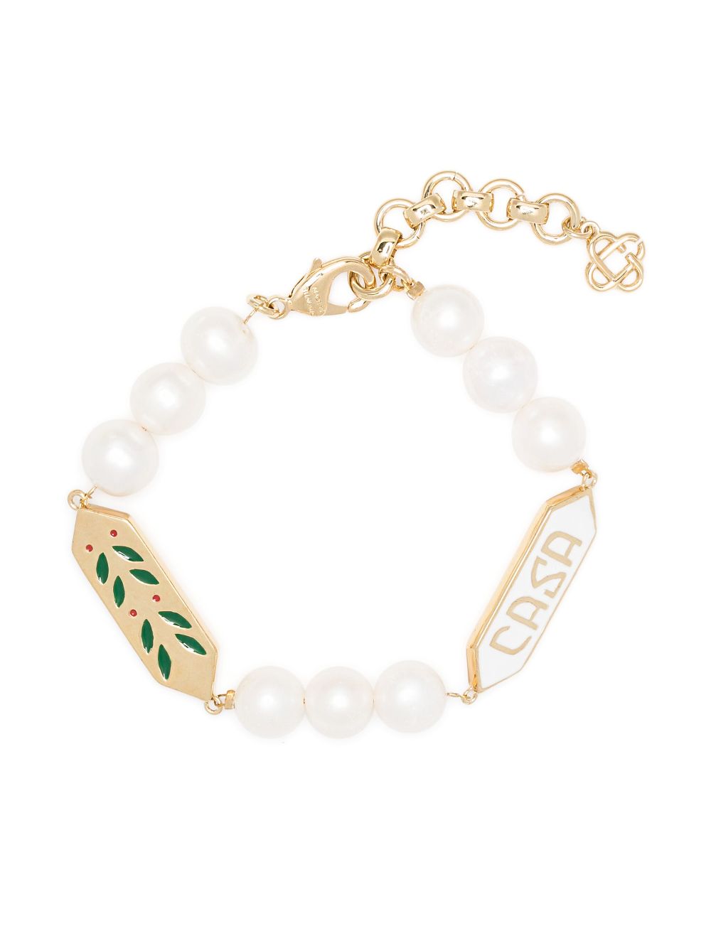Bratara Casablanca Pearl Logo auriu, formata din perle, placute cu logo Casablanca gravat si inchidere carabina. 100% perle; 100% metal. Aceasta bratara vine insotita de cutie.