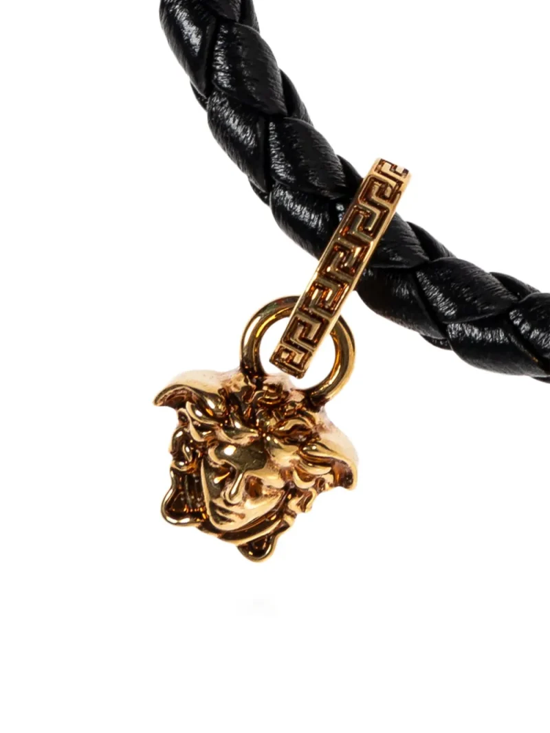 Bratara Versace Medusa braided leather negru, piele impletita, amuleta cap de Medusa, inhidere cu catarama, ornament decorativ.100% piele