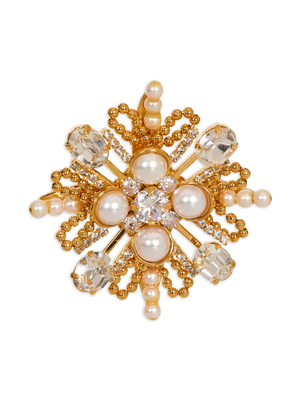 Brosa Balmain Brandebourg auriu, din alama, decorata in stl baroc cu perle si cristale sclipitoare, efect 3D si inchidere pin. 100% cristal; 100% alama.