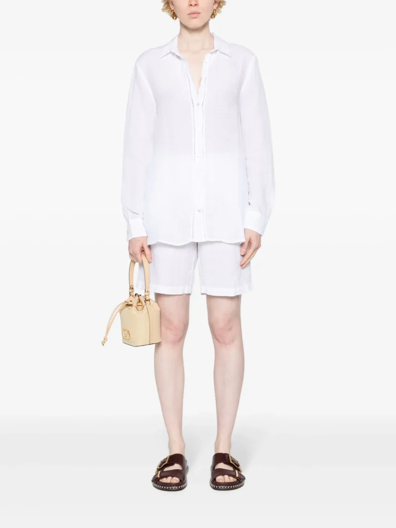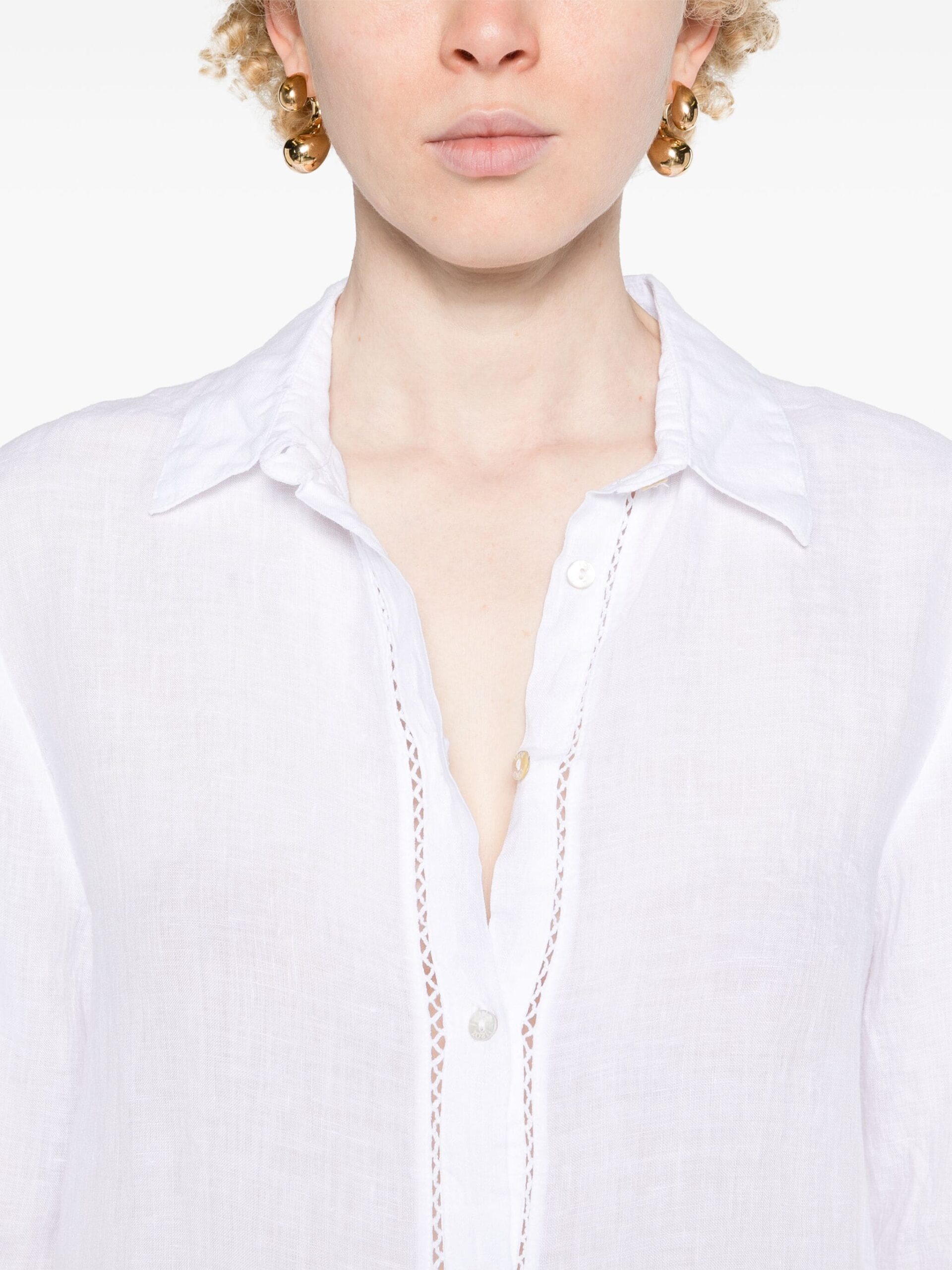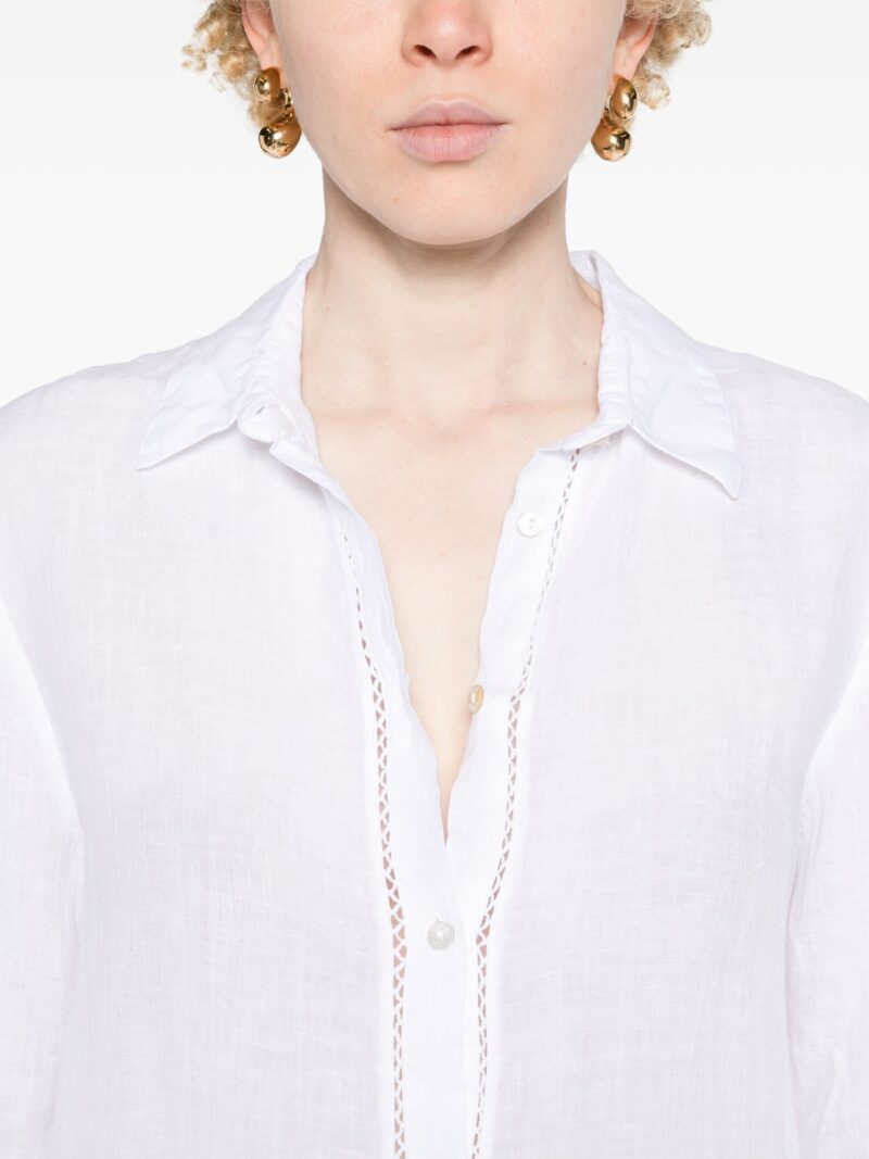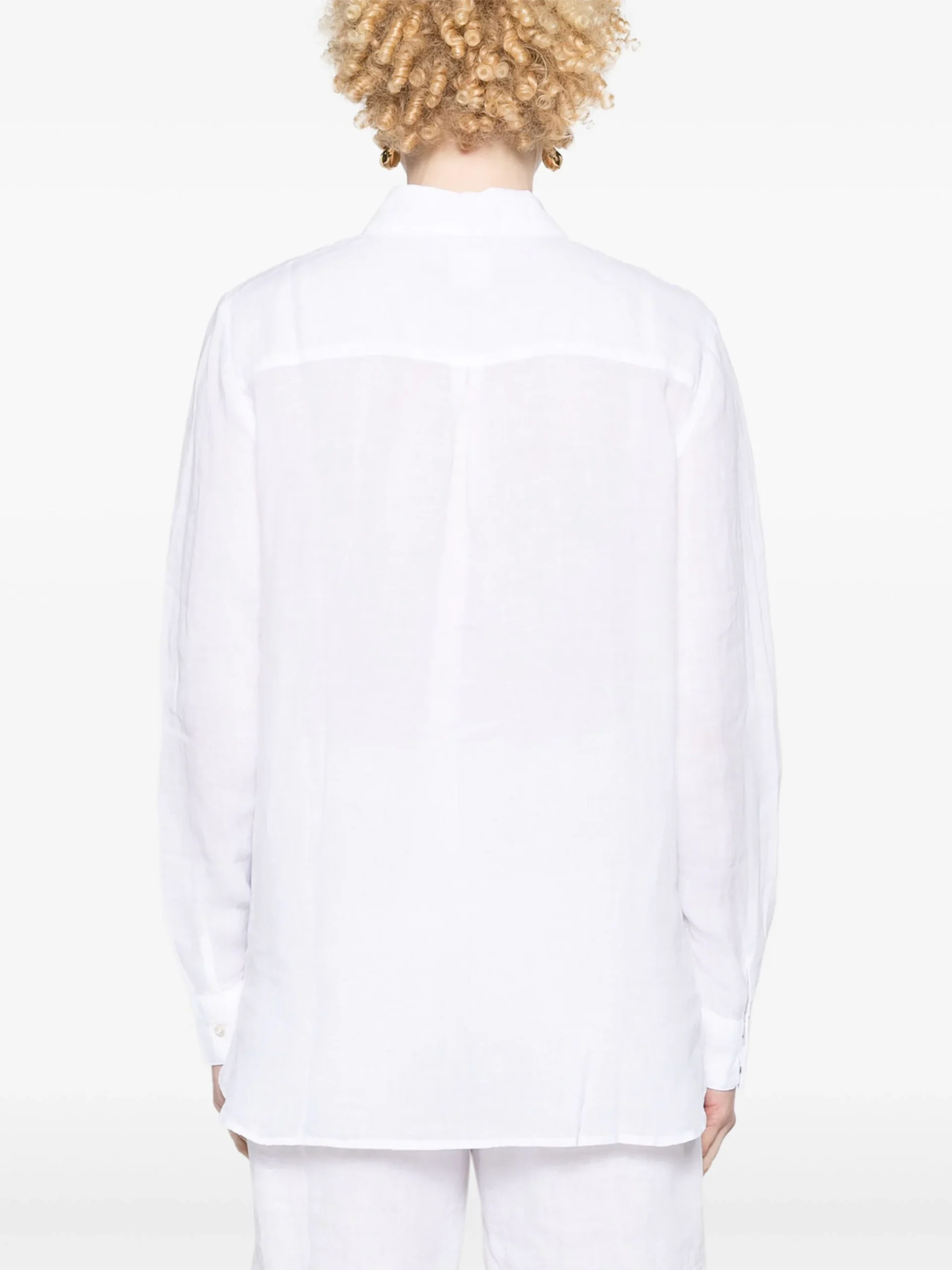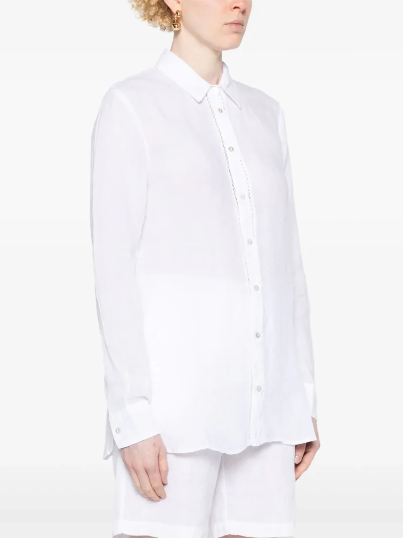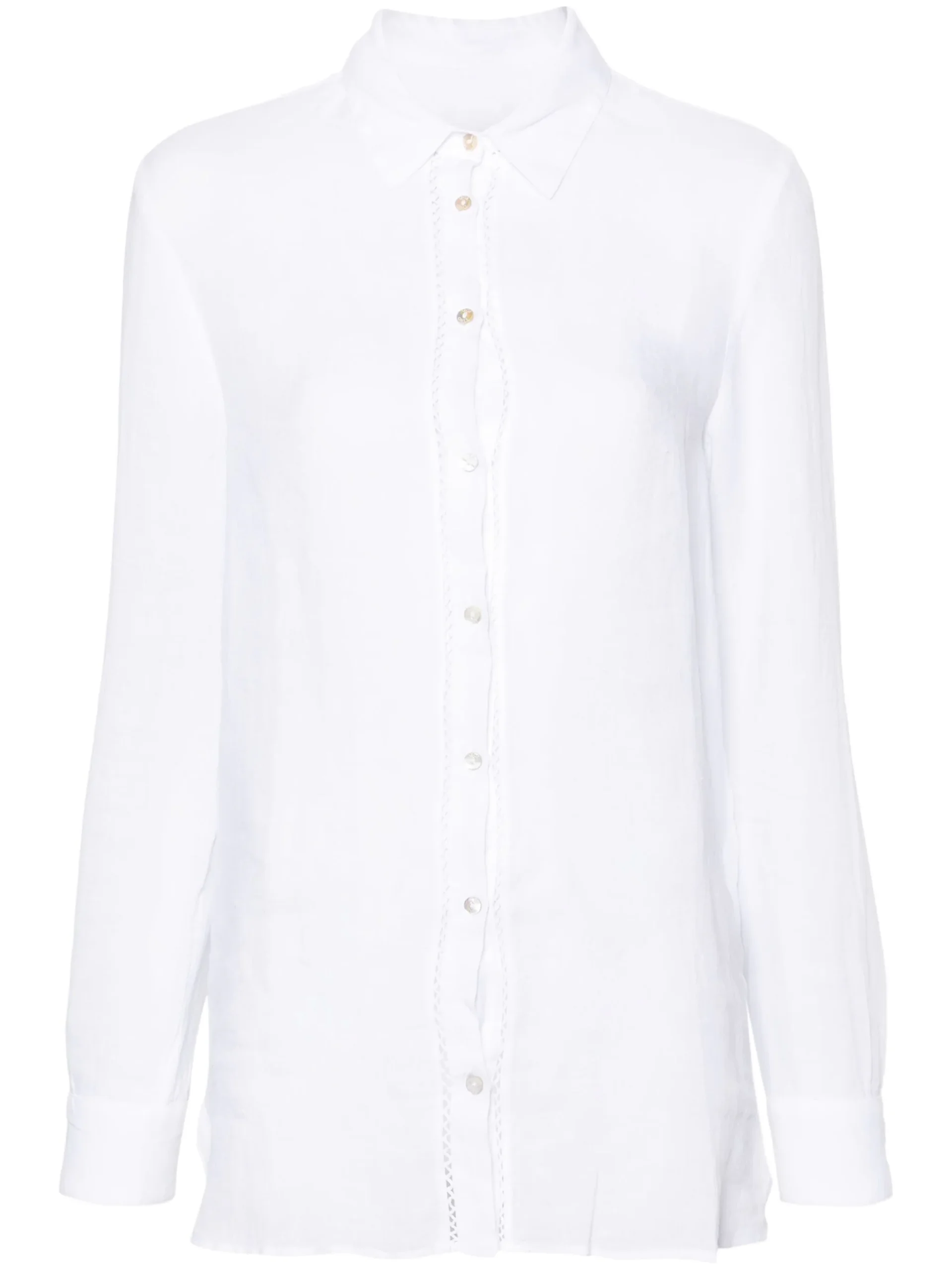 Camasa alba din in, cu guler clasic, inchidere partiala cu nasturi, umeri cazuti, maneci lungi, mansete late, detalii brodate si tiv curbat. Potrivita pentru sezonul primavara/vara. 100% in.