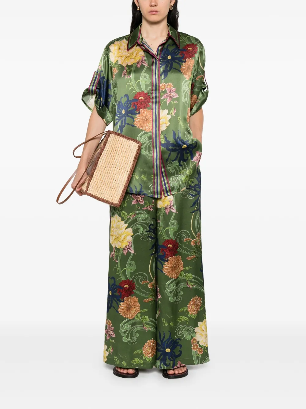 Camasa Alemais Avery khaki, din matase satinata, cu guler clasic, inchidere cu nasturi, maneci scurte cu mansete intoarse, grafica florala imprimata si tiv curbat. Potrivita pentru sezonul toamna/iarna. 100% matase.