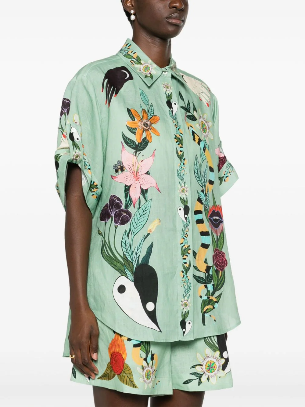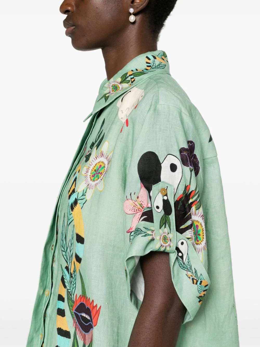 Camasa multicolor din in, cu guler clasic, inchidere cu nasturi ascunsi, maneci medii, grafica Alemais Meagan imprimata pe toata suprafata si tiv curbat. Potrivita pentru sezonul primavara/vara. 100% in.
