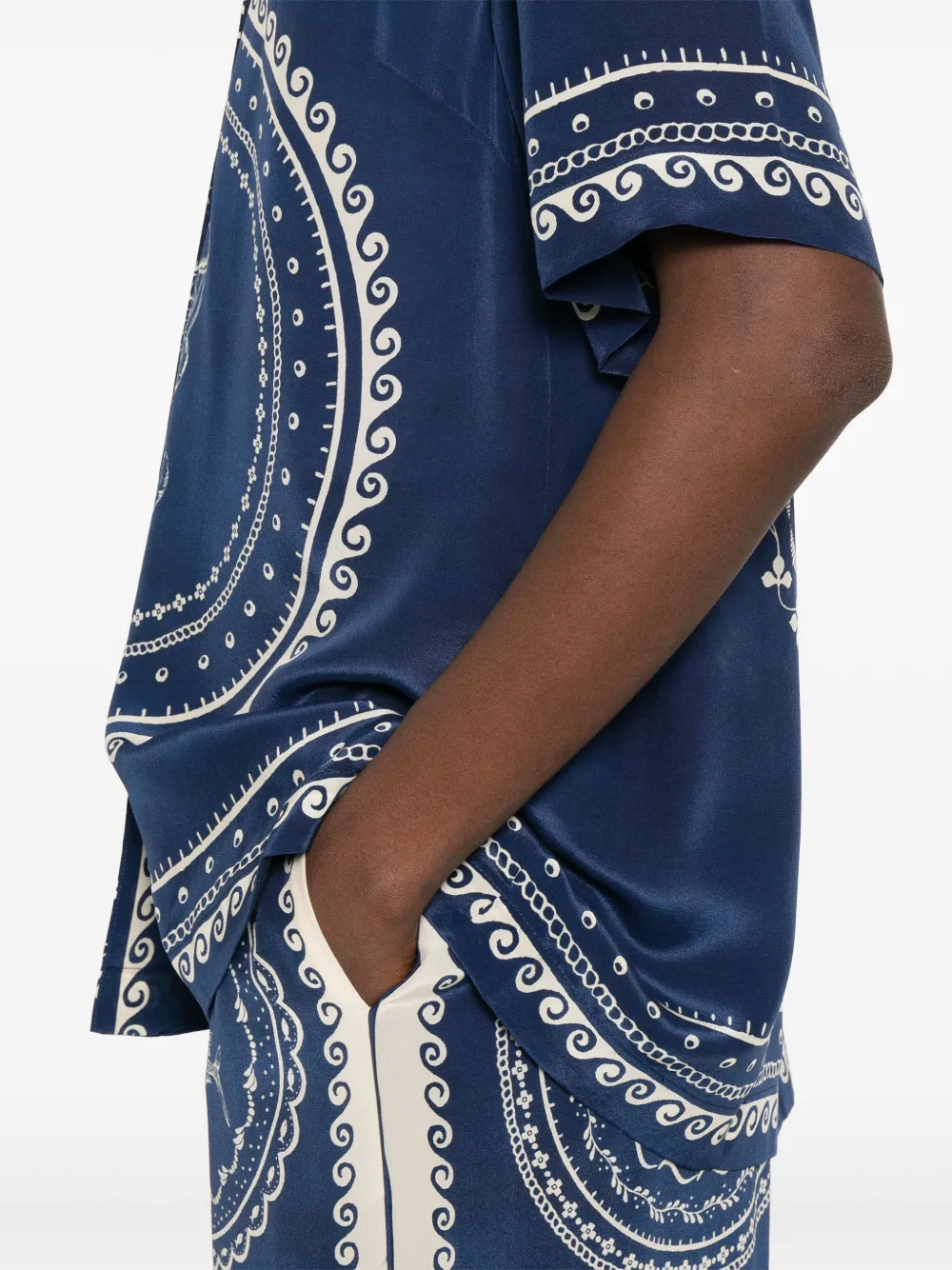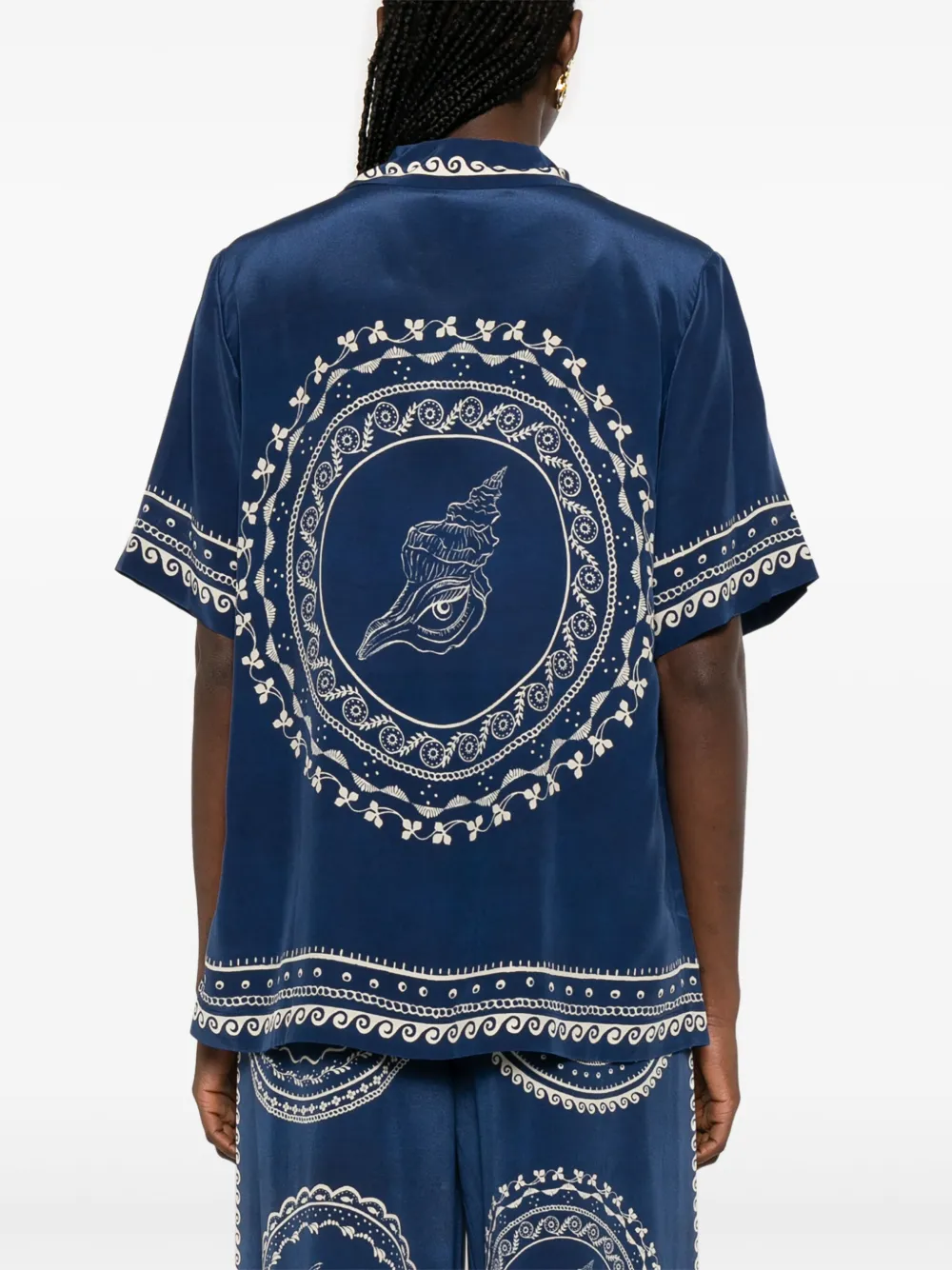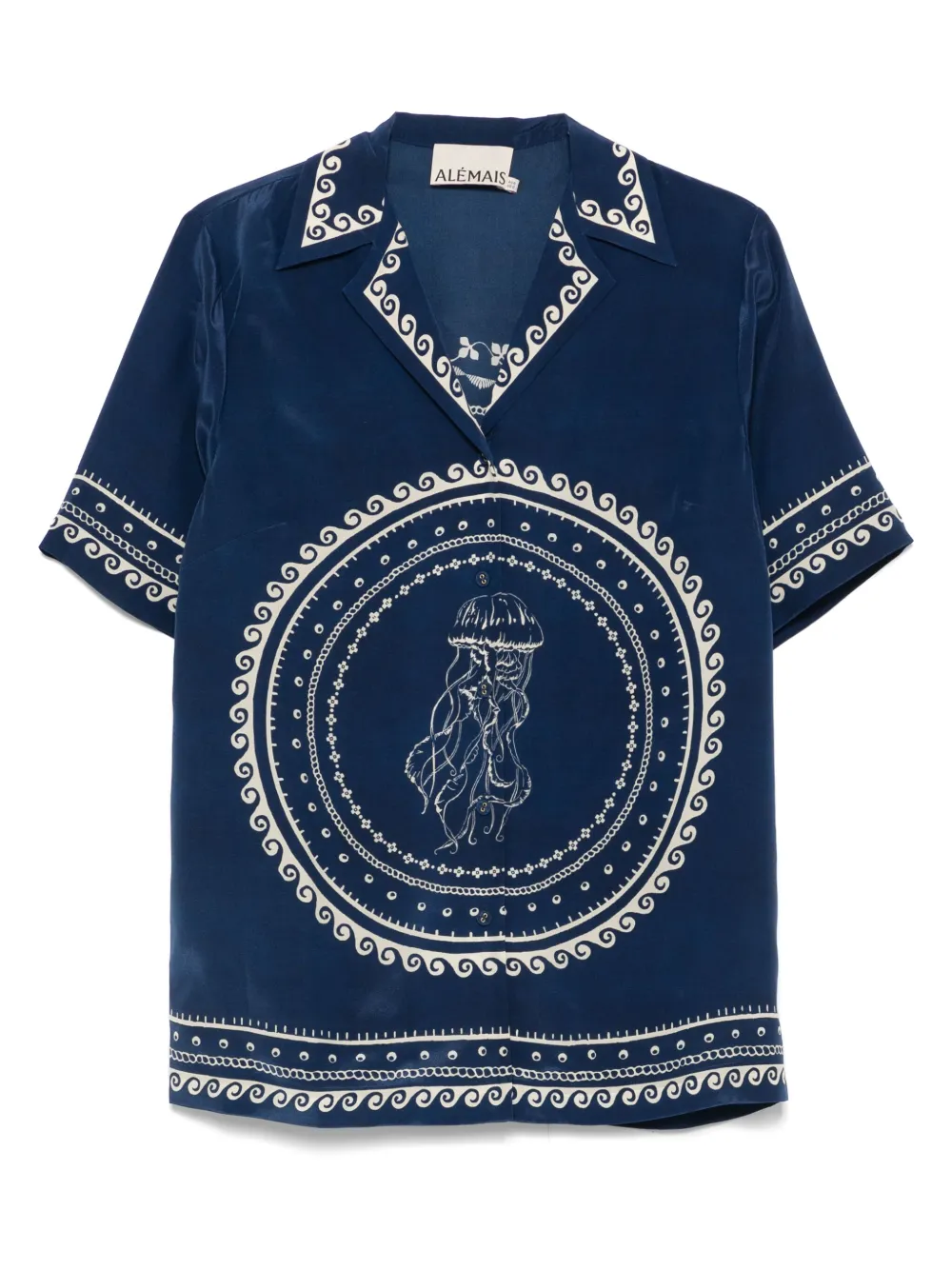 Camasa Alemais Ocean bleumarin, din matase, cu inchidere nasturi, maneci scurte, guler camp, grafica abstracta imprimata si tiv drept. Potrivita pentru sezonul primavara/vara. 100% matase.