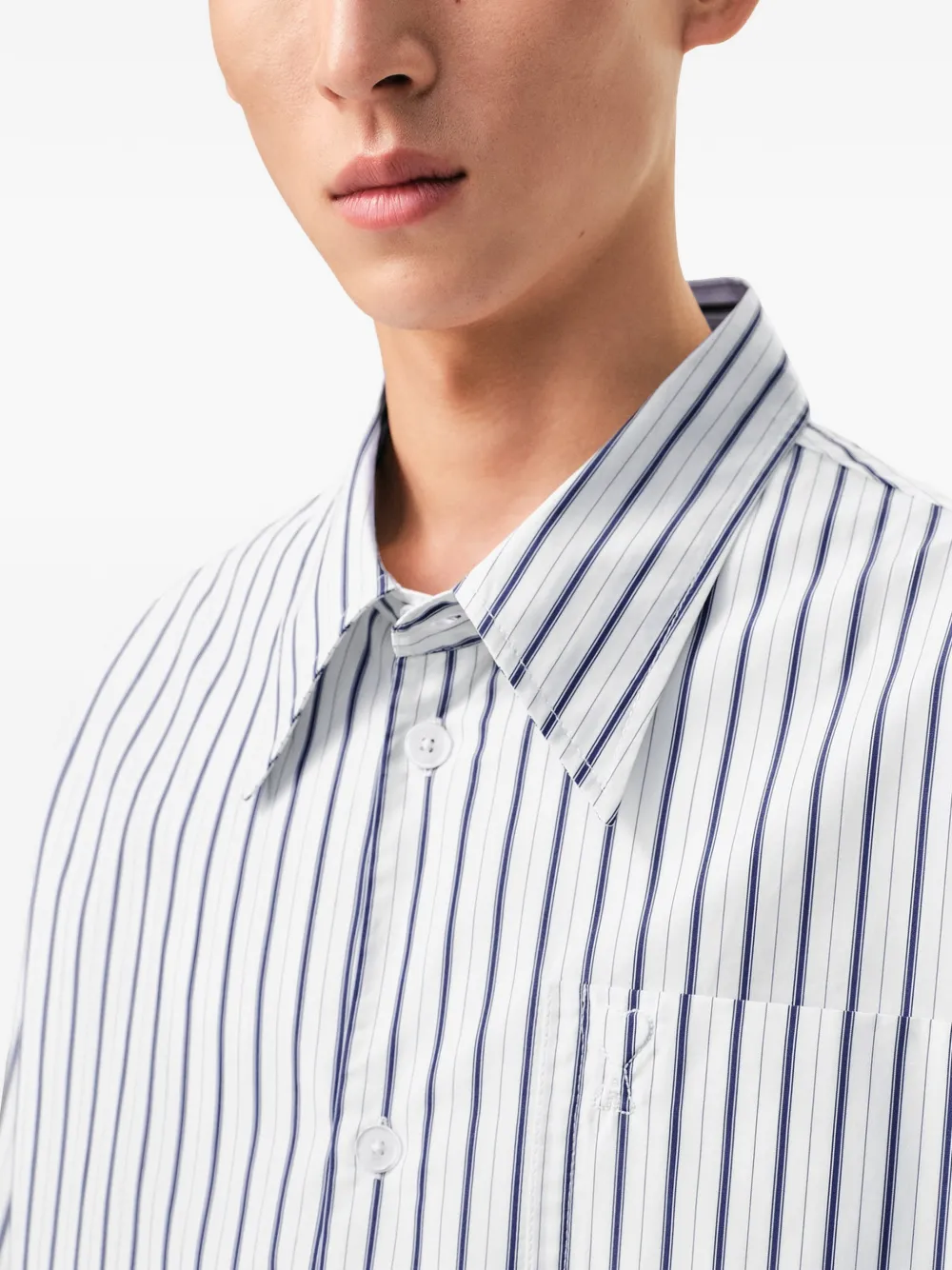 Camasa AMI Paris Ami De Coeur Short-Sleeve alb, realizata din bumbac, cu guler clasic, inchidere cu nasturi, maneci scurte, grafica in dungi, buzunat aplicat la piept decorat cu logo brodat la piept si tiv curbat. Potrivita pentru sezonul primavara/vara. 100% bumbac.
