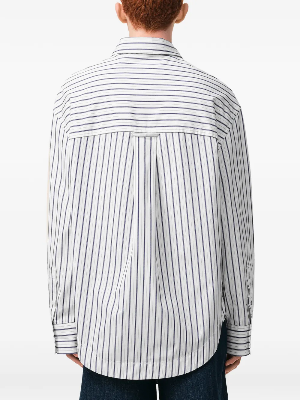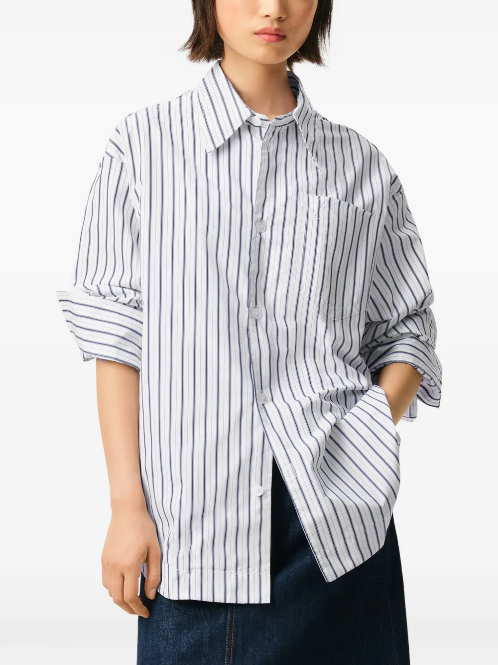 Camasa AMI Paris Ami De Coeur Striped Chest-Pocket alb, unisex, cu guler clasic, inchidere cu nasturi, maneci lungi, mansete cu nasturi, buzunar aplicat la piept, grafica cu dungi in tesatura si tiv curbat. Potrivita pentru sezonul primavara/vara. 100% bumbac.
