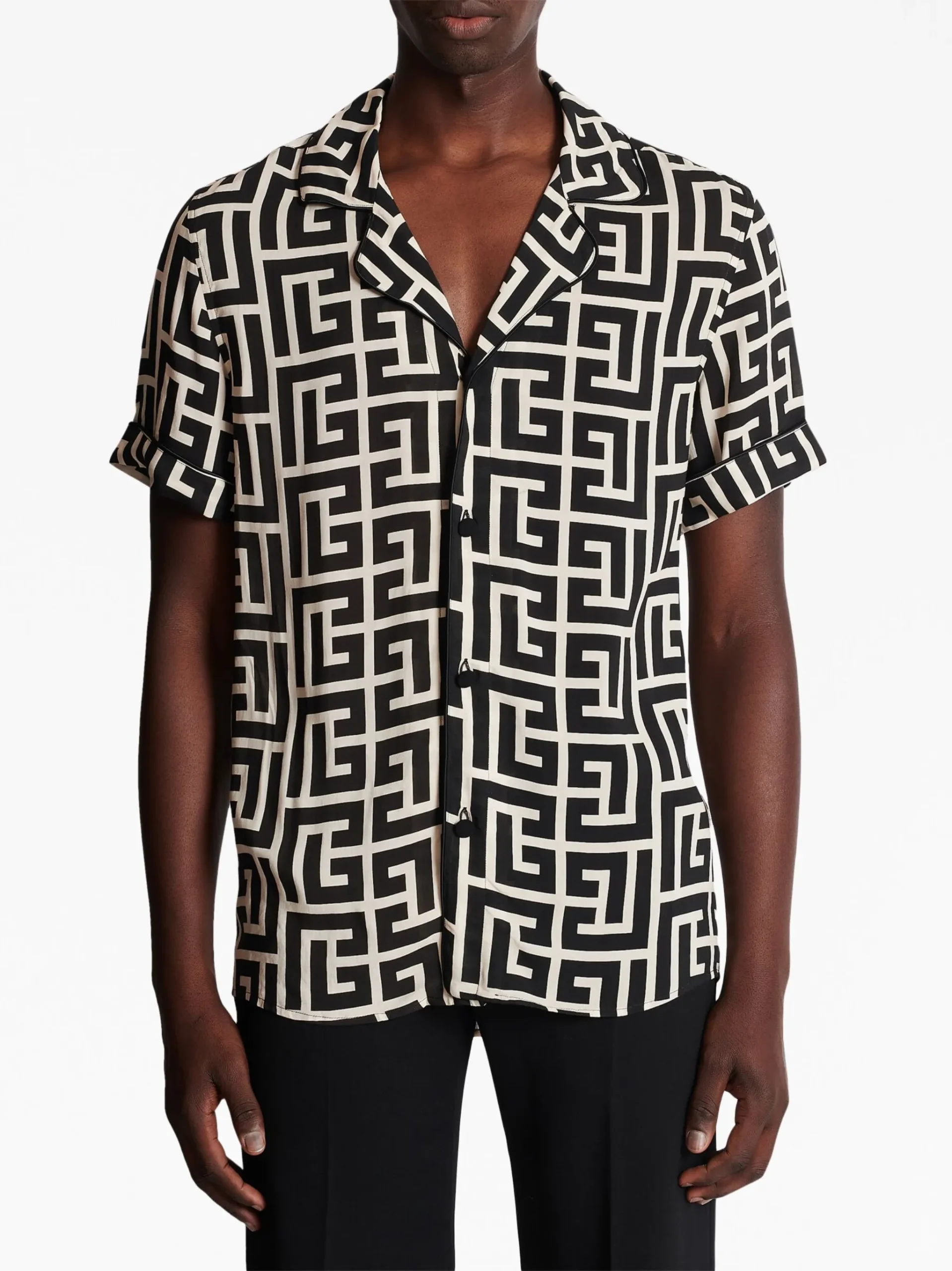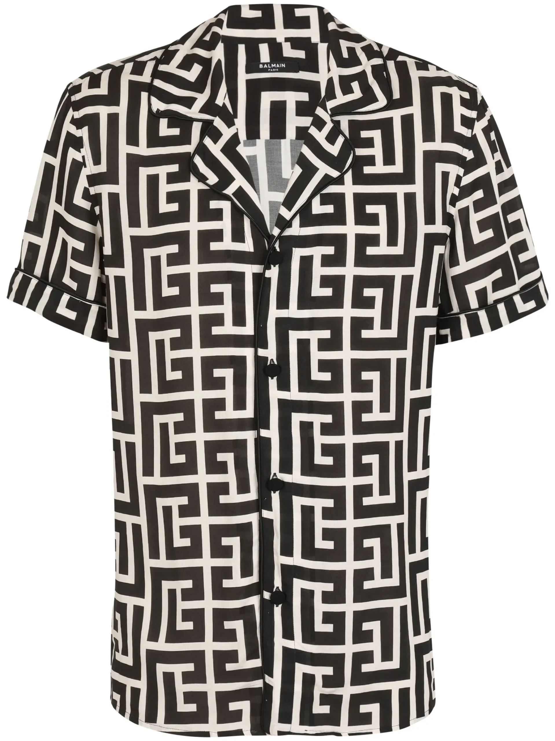 Camasa Balmain monogram-print pyjama alb/negru, cu guler cubanez, maneci scurte cu mansete, inchidere frontala cu nasturi acoperiti si finisaje cu bordura piped.100% vascoza