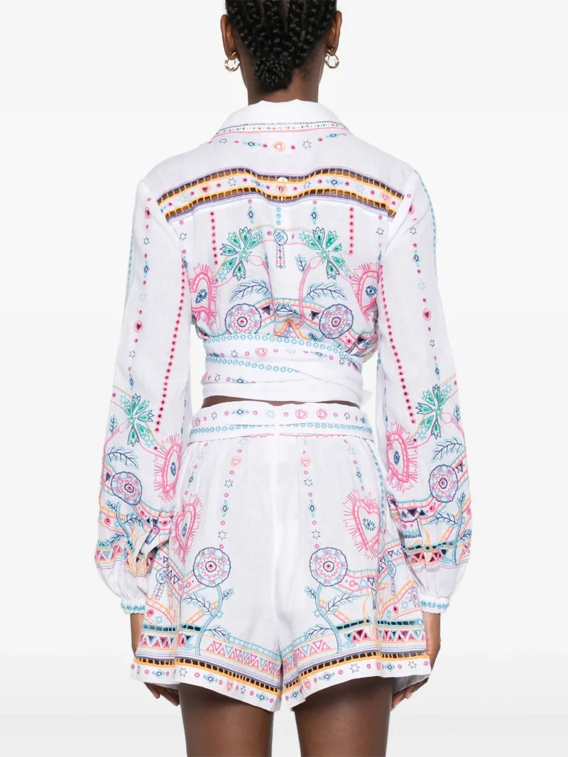 Camasa Camilla Cropped Wrap alba, inchidere cu nod, guler clasic, mansete elastice si broderii florale. Potrivita pentru sezonul primavara/vara. 100% in