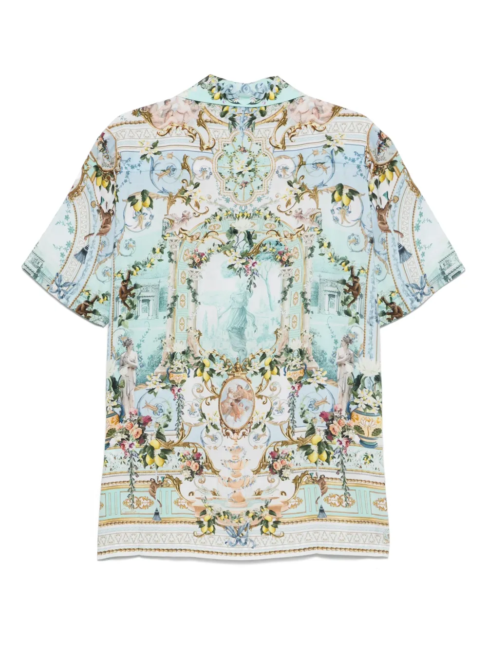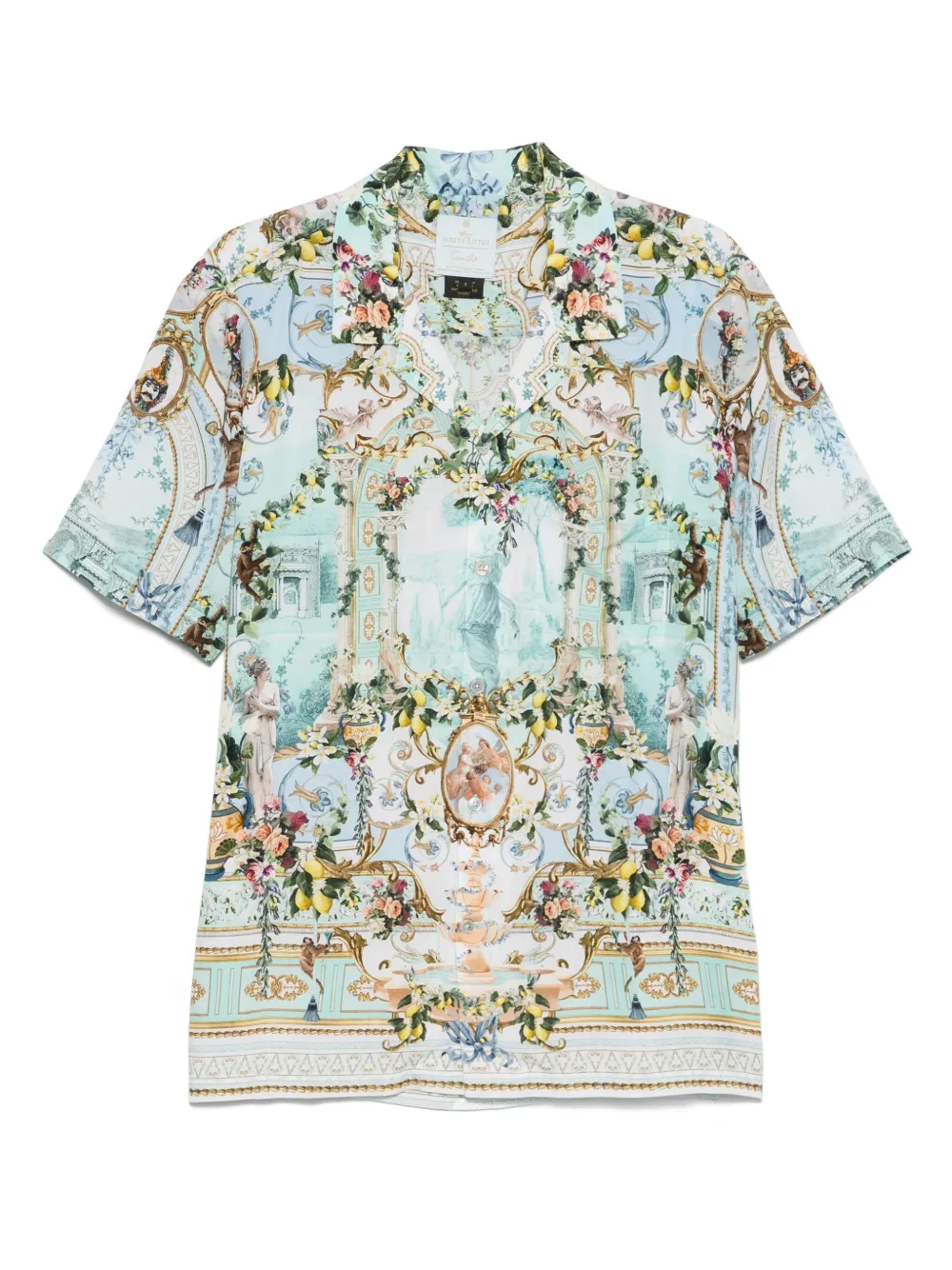 Camasa Camilla Graphic-Print albastru, din modal, cu guler camp, inchidere cu nasturi, maneci scurte, grafica imprimata si tov drept. Potrivita pentru sezonul primavara/vara. 100% modal.
