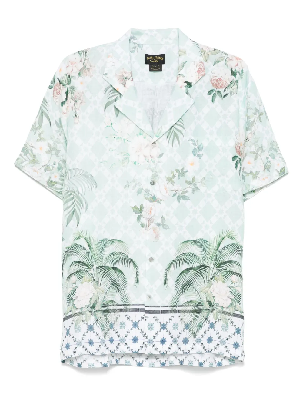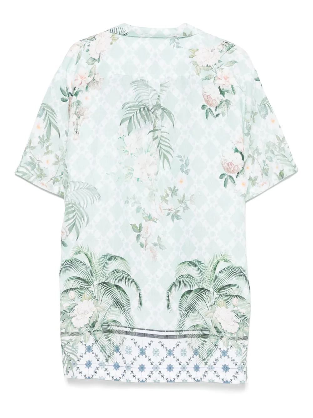 Camasa Camilla Jardim Party-Print verde, din in, cu guler camp, maneci scurte, inchidere cu nastri, grafica Jardim Party imprimata si tiv drept. Potrivita pentru sezonul primavara/vara. 1005 in.