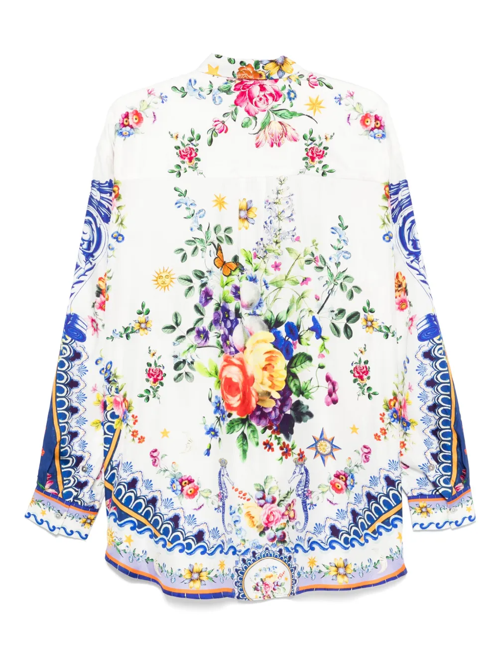 Camasa Camilla Long Sleeve Oversized multicolor, din matase, cu guler clasic, inchidere cu nasturi, maneci lungi, mansete cu nasturi, grafica florala imprimata pe toata suprafata si tiv drept. Potrivita pentru sezonul primavara/vara. 100% matase.