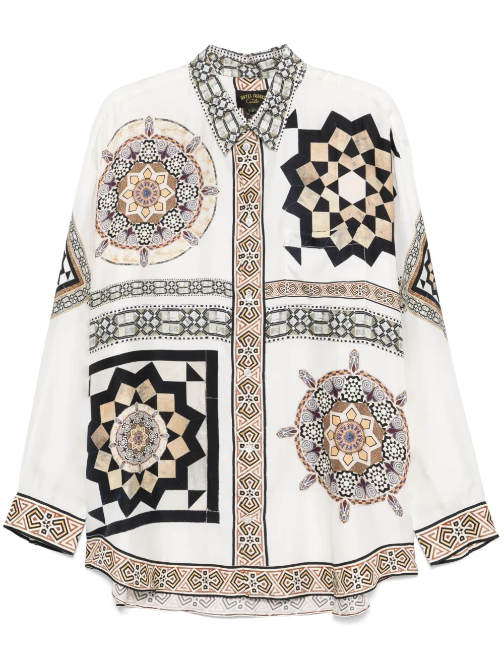 Camasa Camilla Make Me Your Mosaic alb, din matase, cu guler clasic, inchidere cu nasturi, maneci lungi, mansete cu nasturi, grafica ” Make Me Your Mosaic” imprimata pe toata suprafata, croiala larga si tiv drept. Potrivita pentru sezonul primavara/vara. 100% matase.