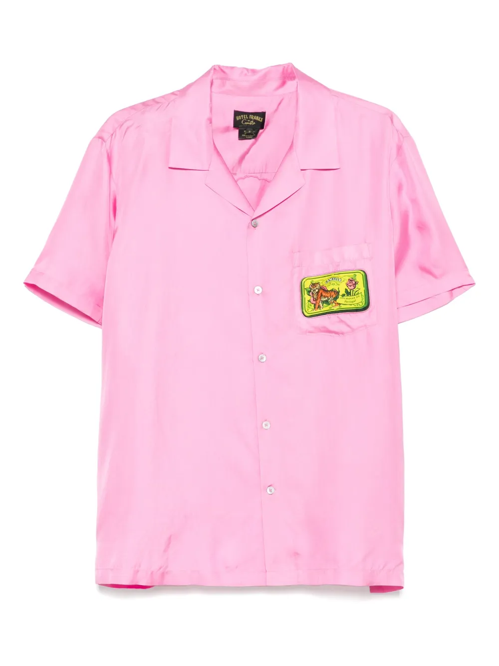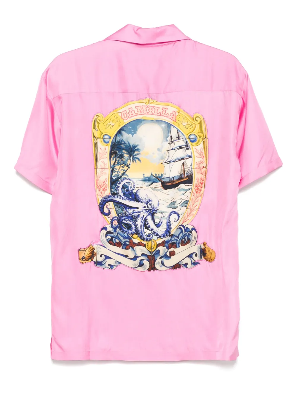 Camasa Camilla Salty Splendour-Print roz, din matase, cu guler camp, inchidere cu nasturi, maneci scurte, buzunar aplicat la piept, grafica imprimata pe spate si tiv drept. Potrivita pentru sezonul primavara/vara. 100% matase.