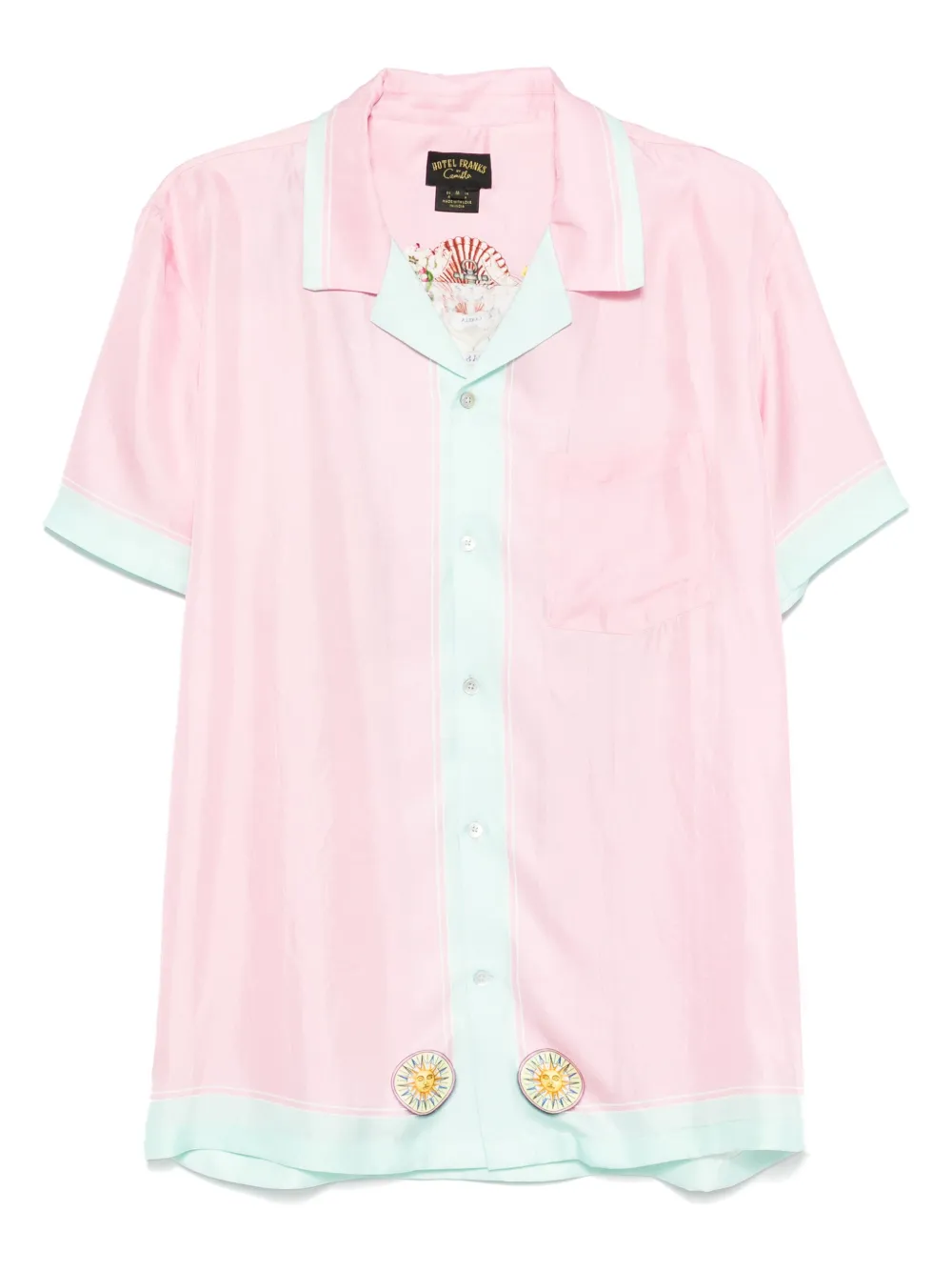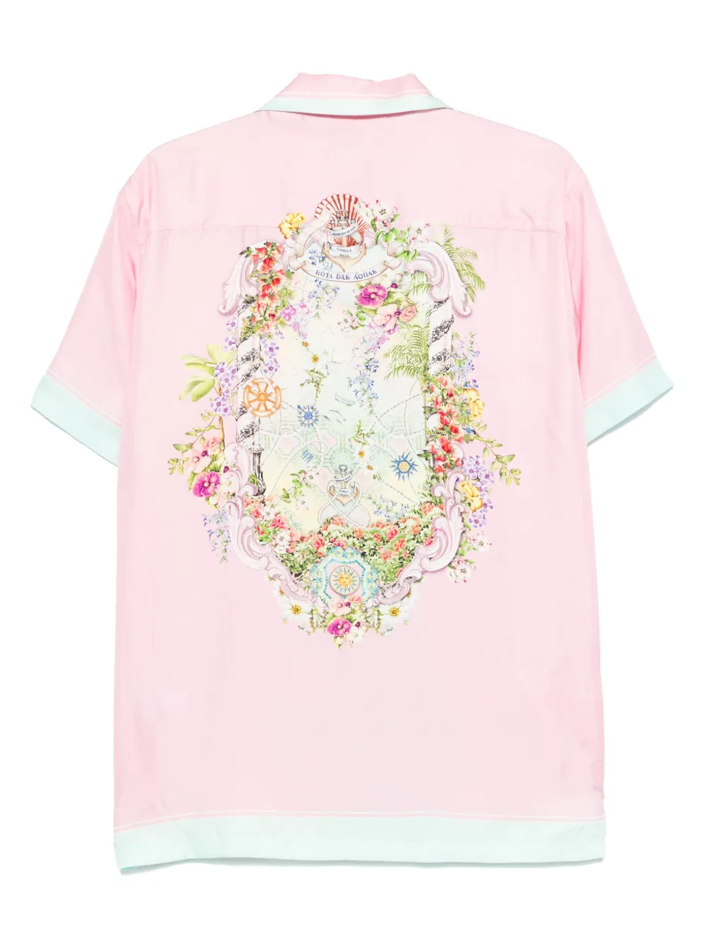 Camasa Camilla Silk roz, din matase, cu guler camp, inchidere cu nasturi, umeri cazuti, maneci scurte, grafica imprimata pe spate si tiv drept. Potrivita pentru sezonul primavara/vara. 100% matase.