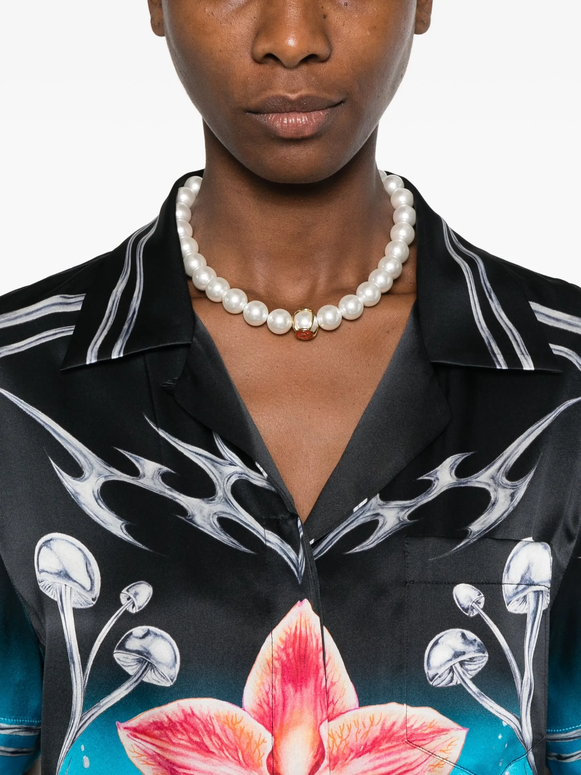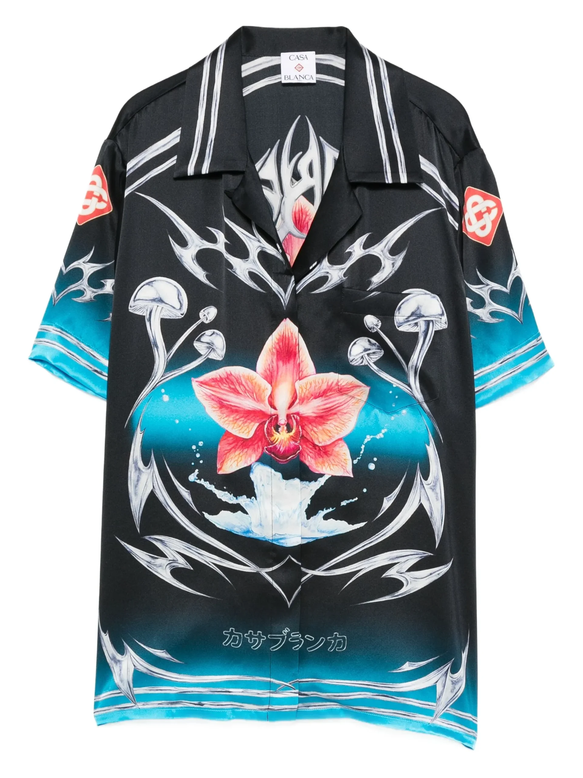 Camasa Casablanca orchid-print silk multicolor din matase premium, inchidere cu nasturi, imprimeu pe intreaga suprafata si maneci scurte.100% matase