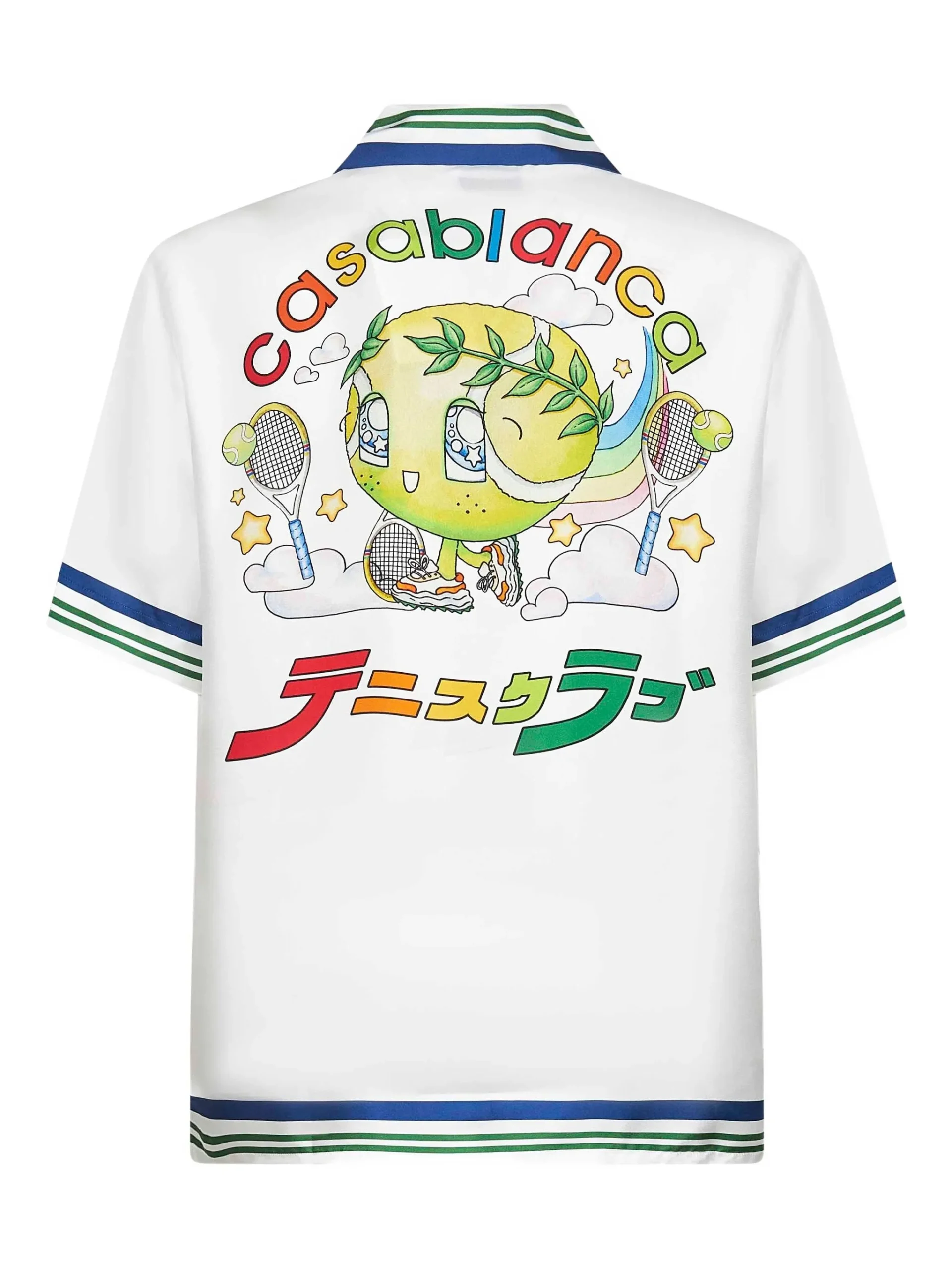 Camasa Casablanca Tennis Mascot alb din matase premium, inchidere cu nasturi, maneci scurte, buzunar aplicat si imprimeu pe partea din spate. 100% matase