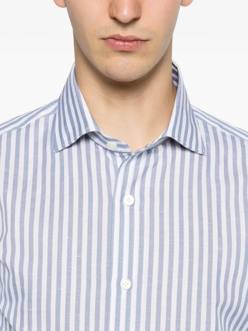 Camasa Eleventy Vertical-Stripe Spread-Collar alb, realizata din mix de bumbac si in, cu guler spread, inchidere cu nasturi, maneci lungi, inchidere cu nasturi, gafica cu dung si tiv drept. Potrivita pentru sezonul primavara/vara. 68% bumbac; 32% in.