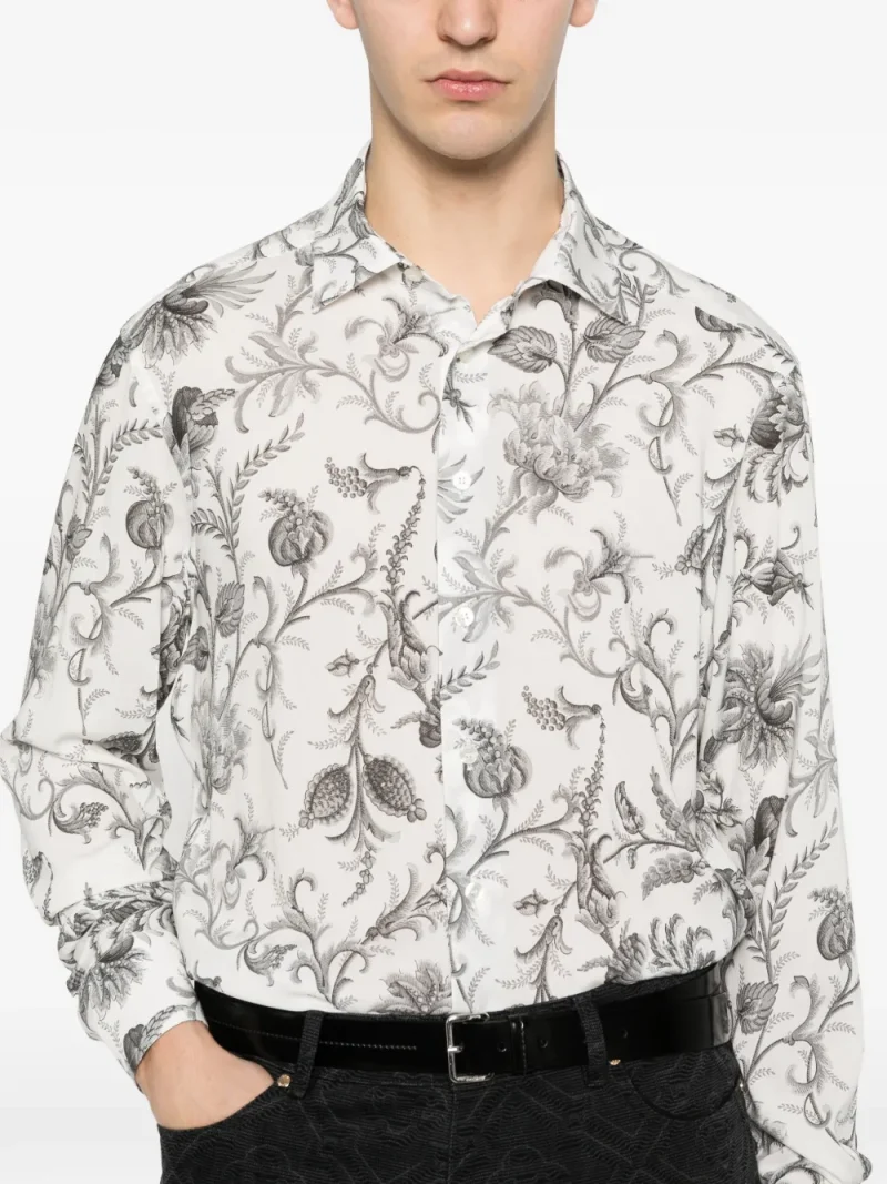 Camasa ETRO Floral-Detail alb, realizata din viscoza, cu guler clasic, inchidere cu nasturi, maneci lungi, mansete cu nasturi, grafica florala imprimata si tiv curbat. Potrivita pentru sezonul primavara/vara. 97% viscoza; 3% elastan.
