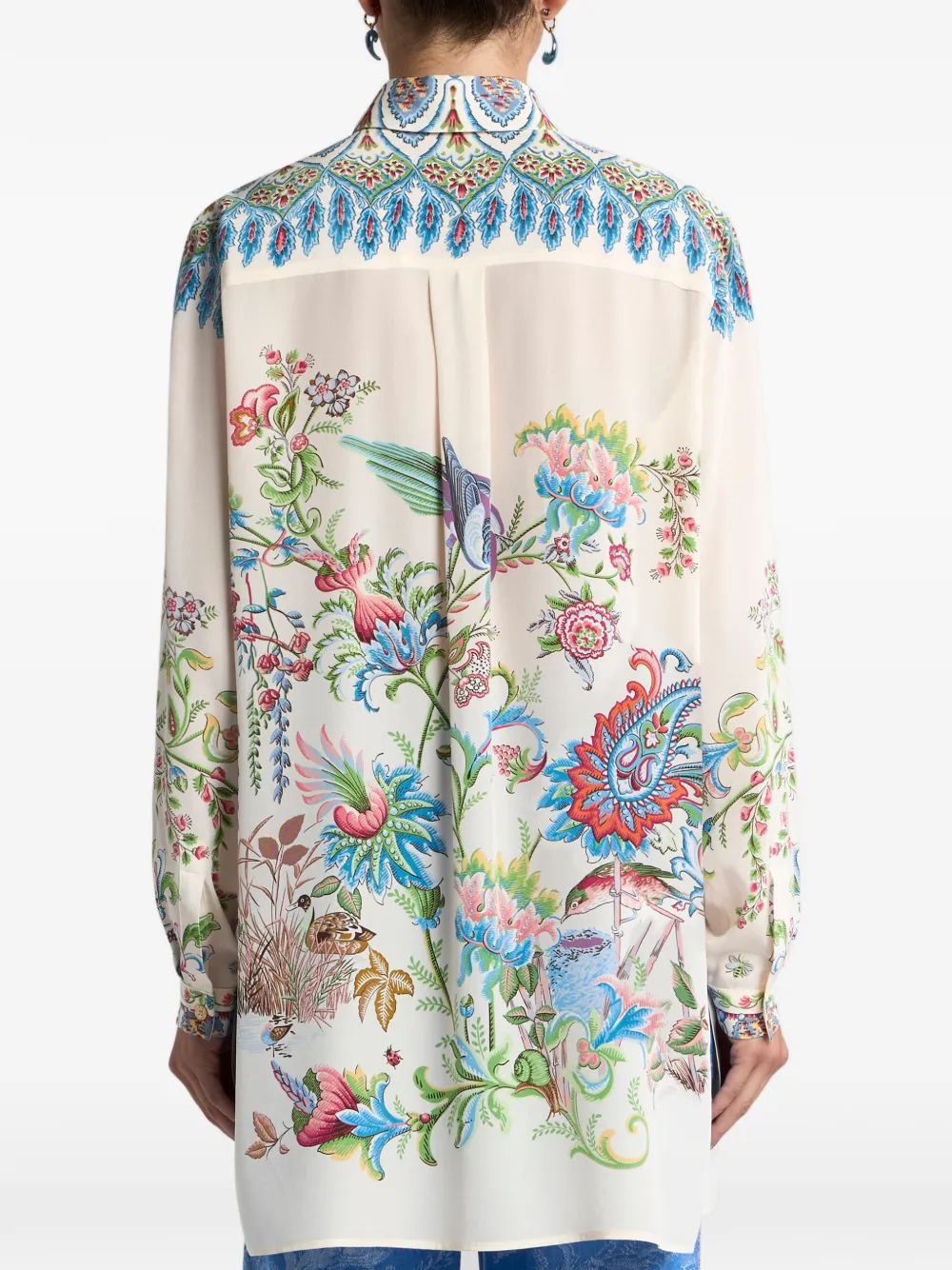 Camasa ETRO Floral-Print Silk bej, realizata din matase, cu guler clasic, inchidere cu nasturi ascunsi, maneci lungi, mansete cu nasturi, decorata cu grafica florala si tiv drept. Potrivita pentru sezonul primavara/vara. 100% matase.