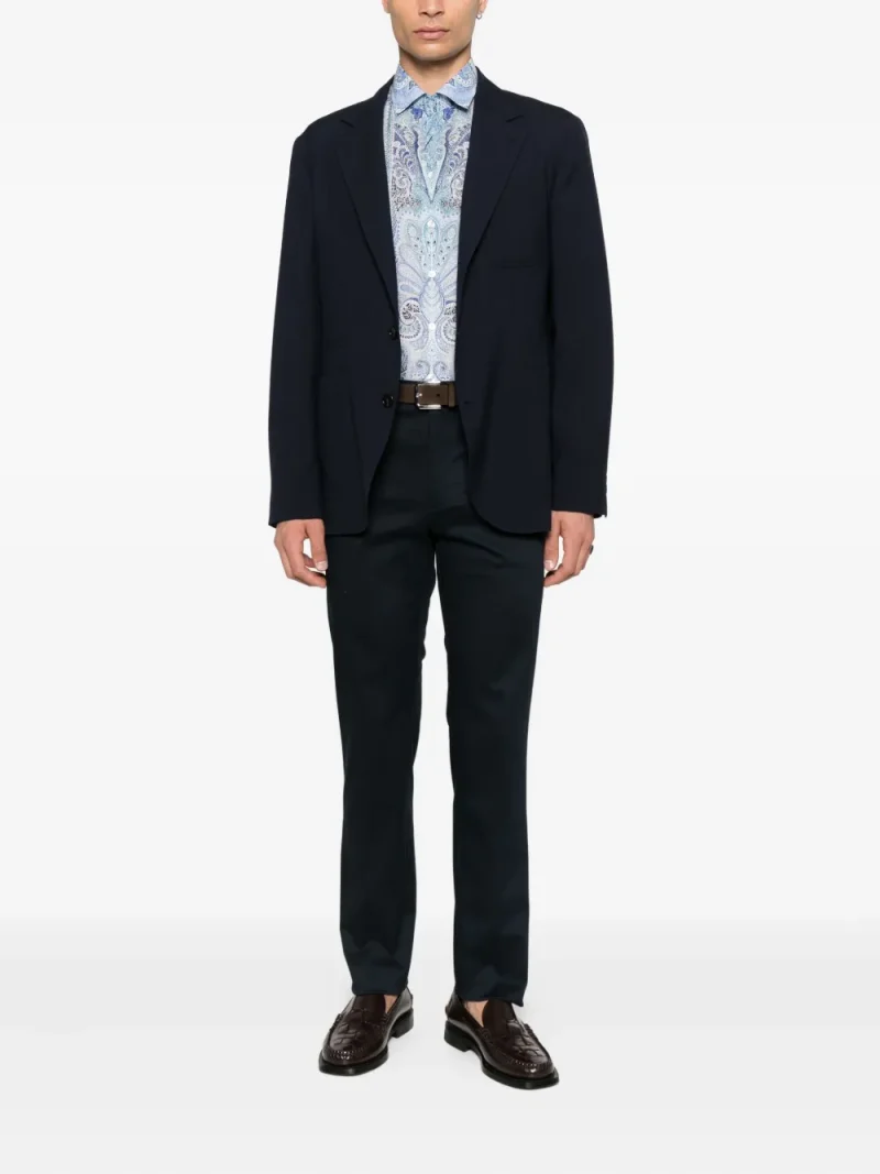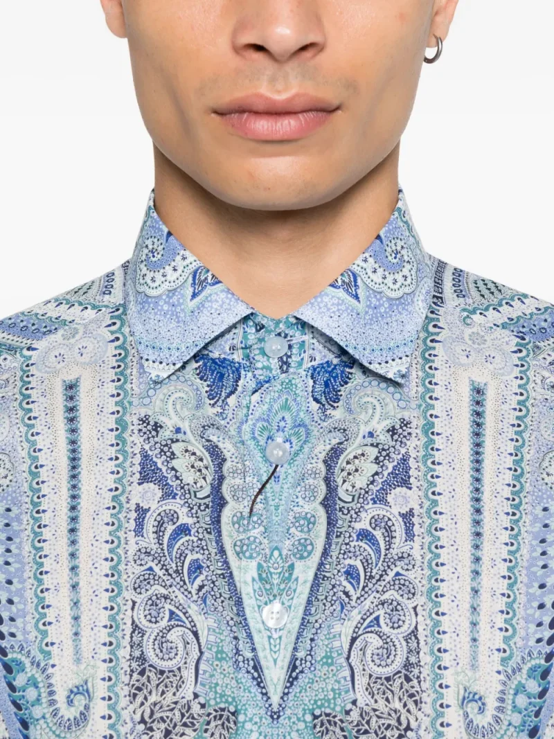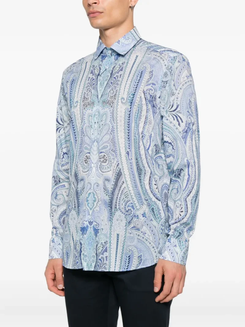 Camasa ETRO Paisley-Print albastru, din bumbac, cu guler clasic, inchidere cu nasturi, maneci lungi si mansete cu nasturi, grafica Paisley imprimata pe toata suprafata si tiv curbat. Potrivita pentru sezonul toamna/iarna. 100% bumbac.