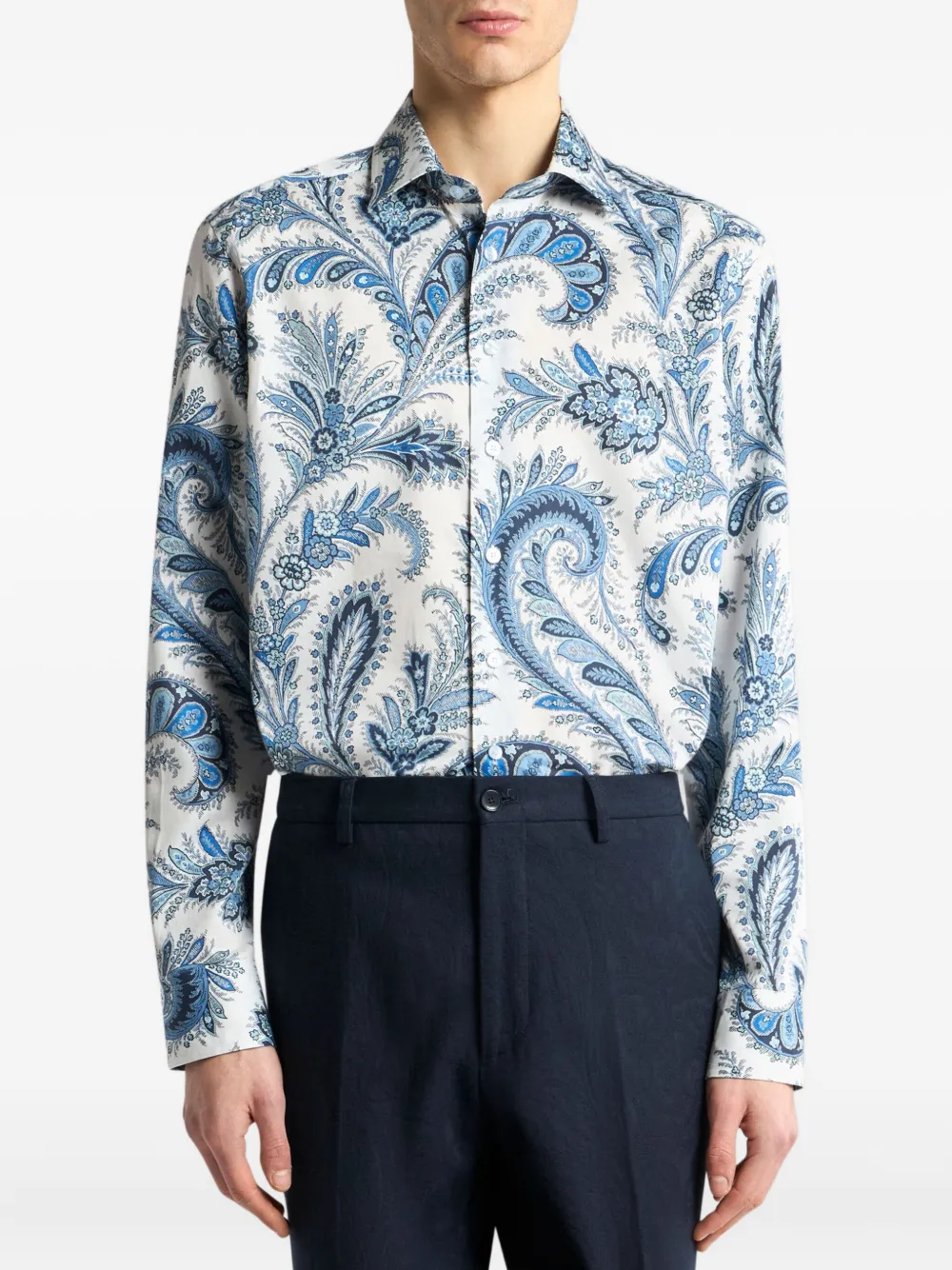 Camasa ETRO Paisley-Print Long-Sleeve albastru, din bumbac, cu guler clasic, inchidere cu nasturi, maneci lungi, mansete cu nasturi, grafica Paisley imprimata si tiv drept. Potrivita pentru sezonul primavara/vara. 100% bumbac.