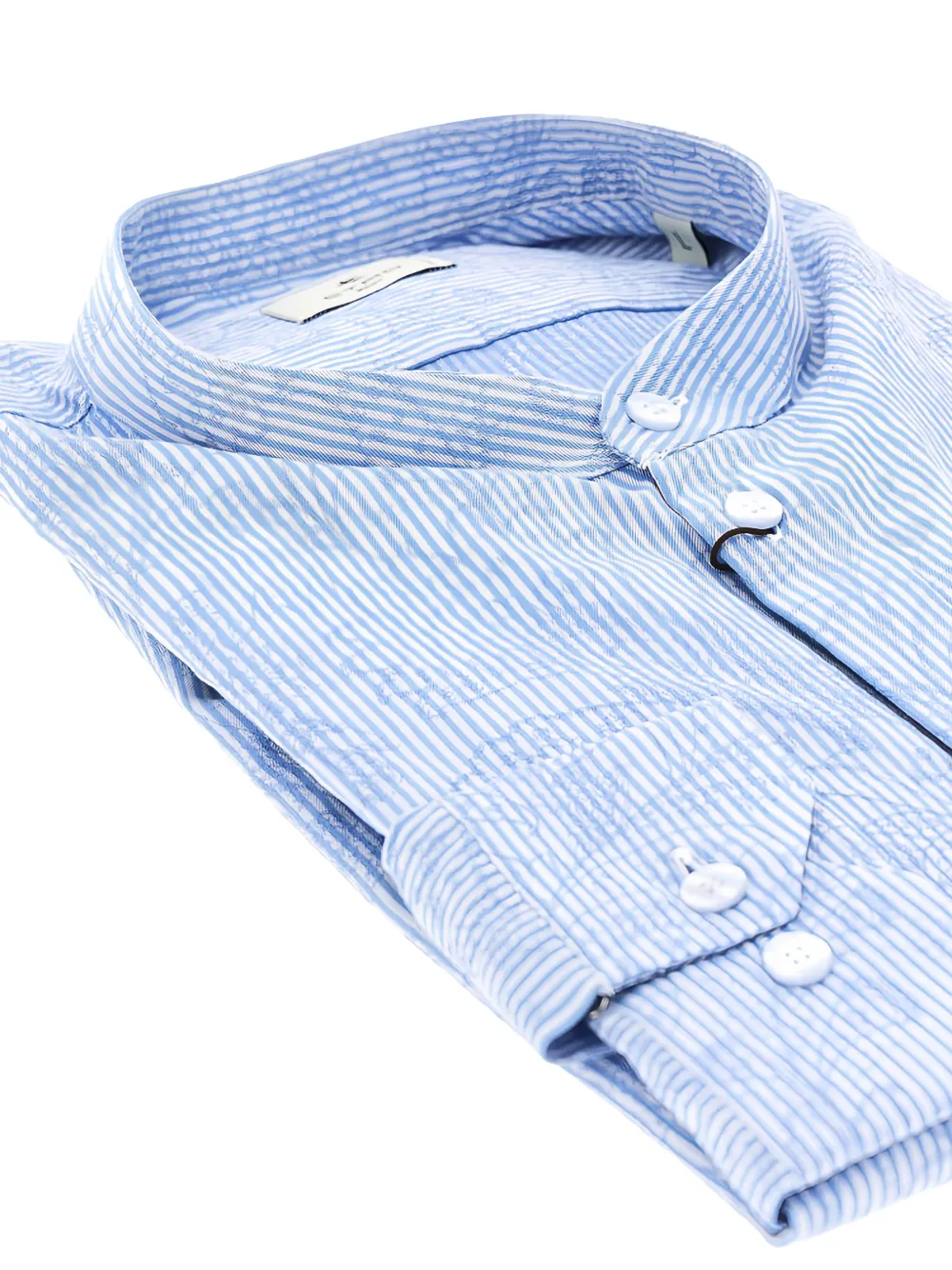 Camasa ETRO Striped Band-Collarl albastru, realizata din bumbac, cu guler tunica, inchidere cu nasturi, maneci lungi, grafica in dungi si logo brodat la piept. Potrivita pentru sezonul primavara/vara. 100% bumbac.