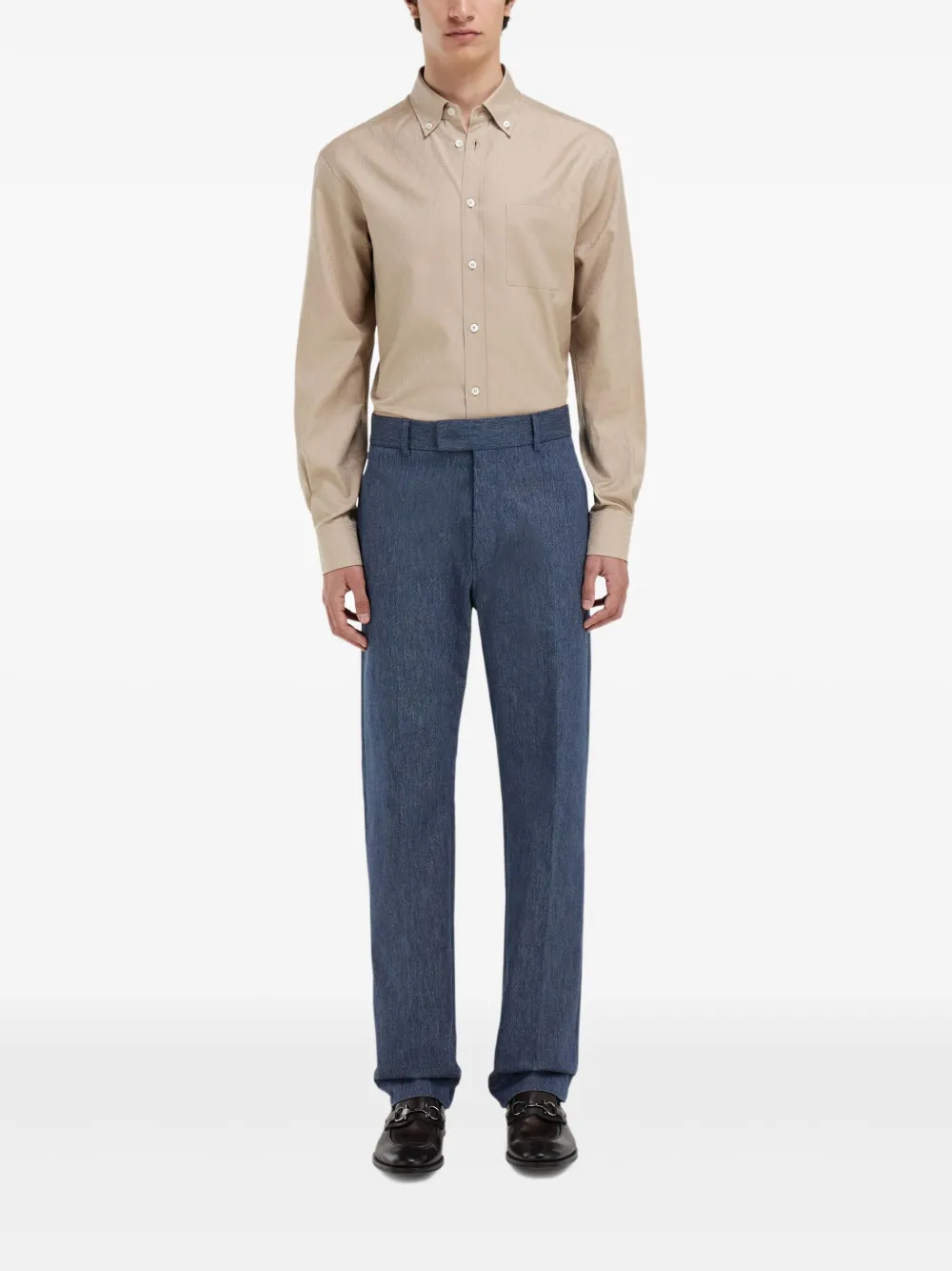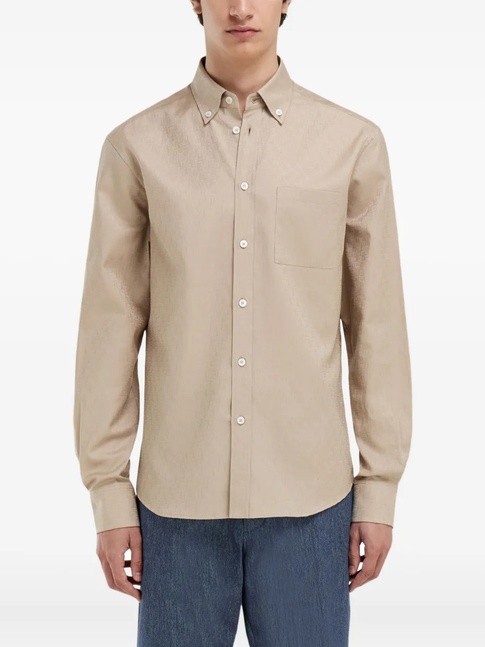 Camasa Ferragamo Monogram Button-Down bej, realizata din bumbac, cu guler clasic, inchidere cu nasturi, maneci lungi, mansete cu nasturi, buzunar aplicat la piept, logo monogram in tesatura si tiv drept. Potrivita pentru sezonul primavara/vara. 100% bumbac.