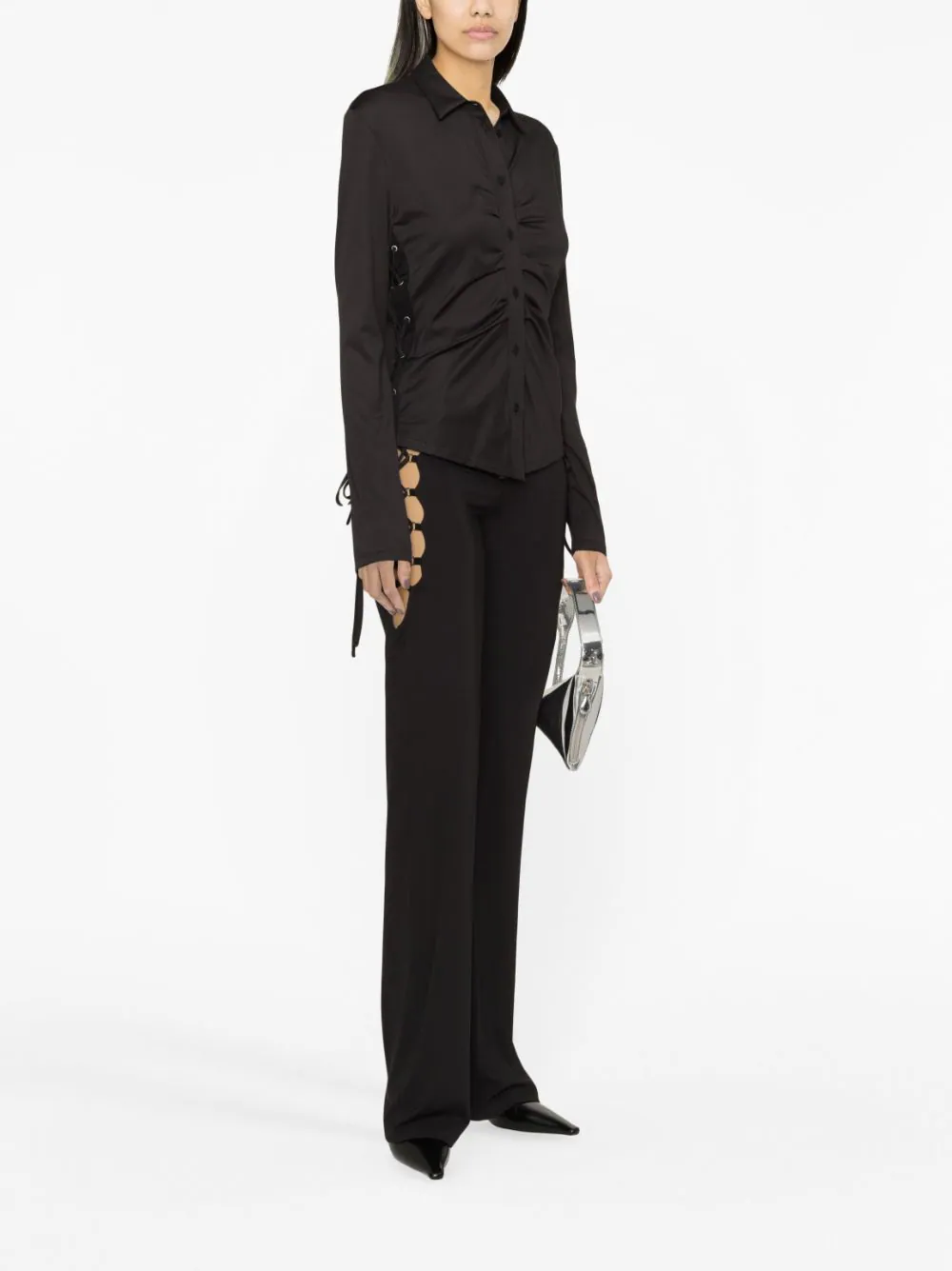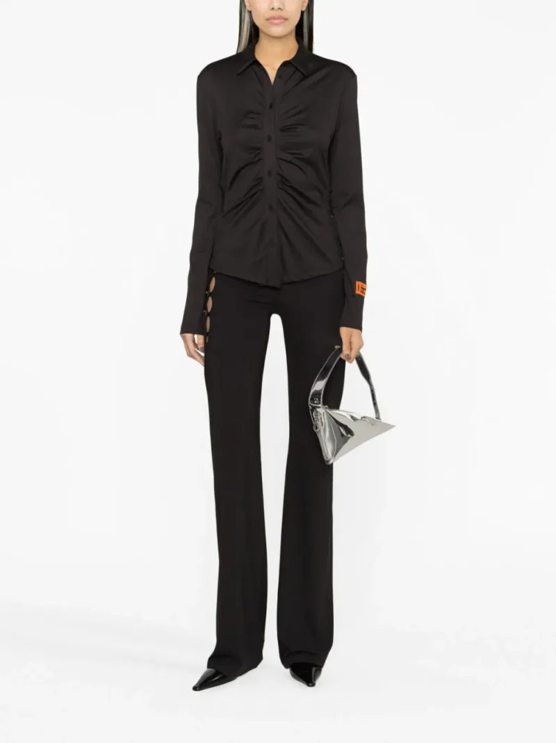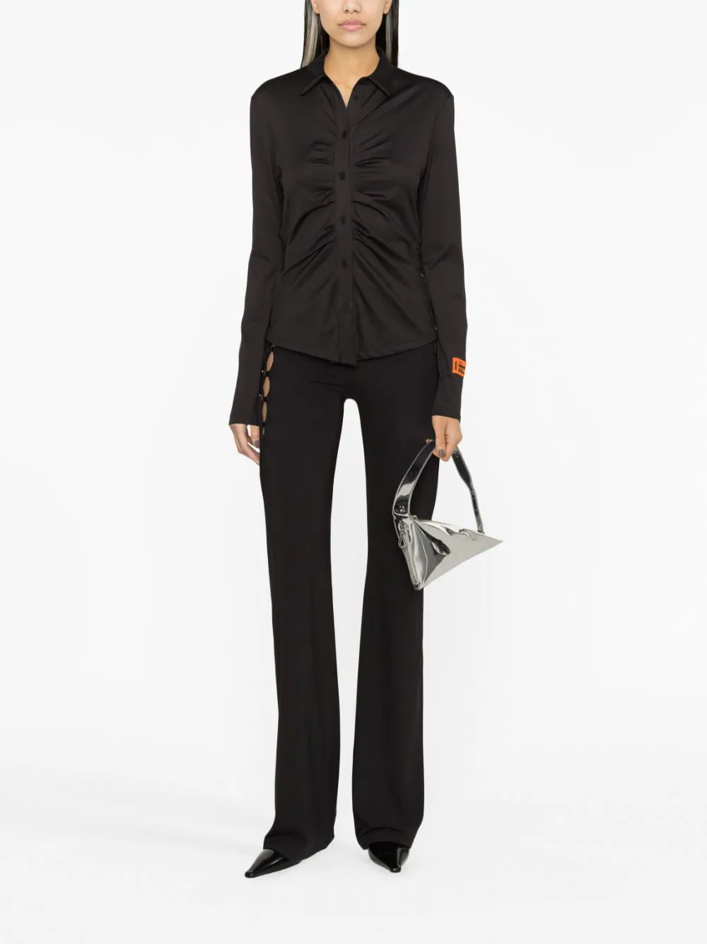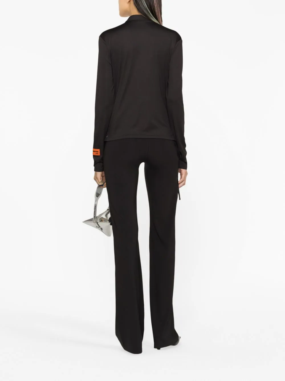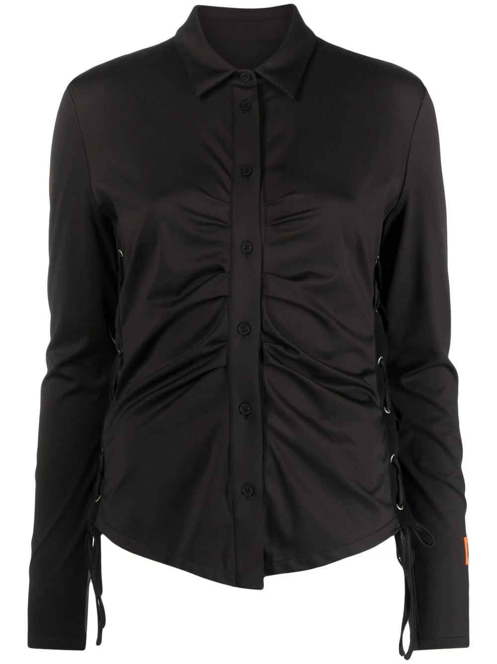Camasa neagra din poliamida, cu guler clasic, inchidere cu nasturi, maneci lungi, eticheta iconica Heron Preston cusuta pe maneca, detalii plisate, sireturi pe laterale si tiv asimetric. Potrivita pentru sezonul toamna/iarna. 87% poliamida; 13% elastan.