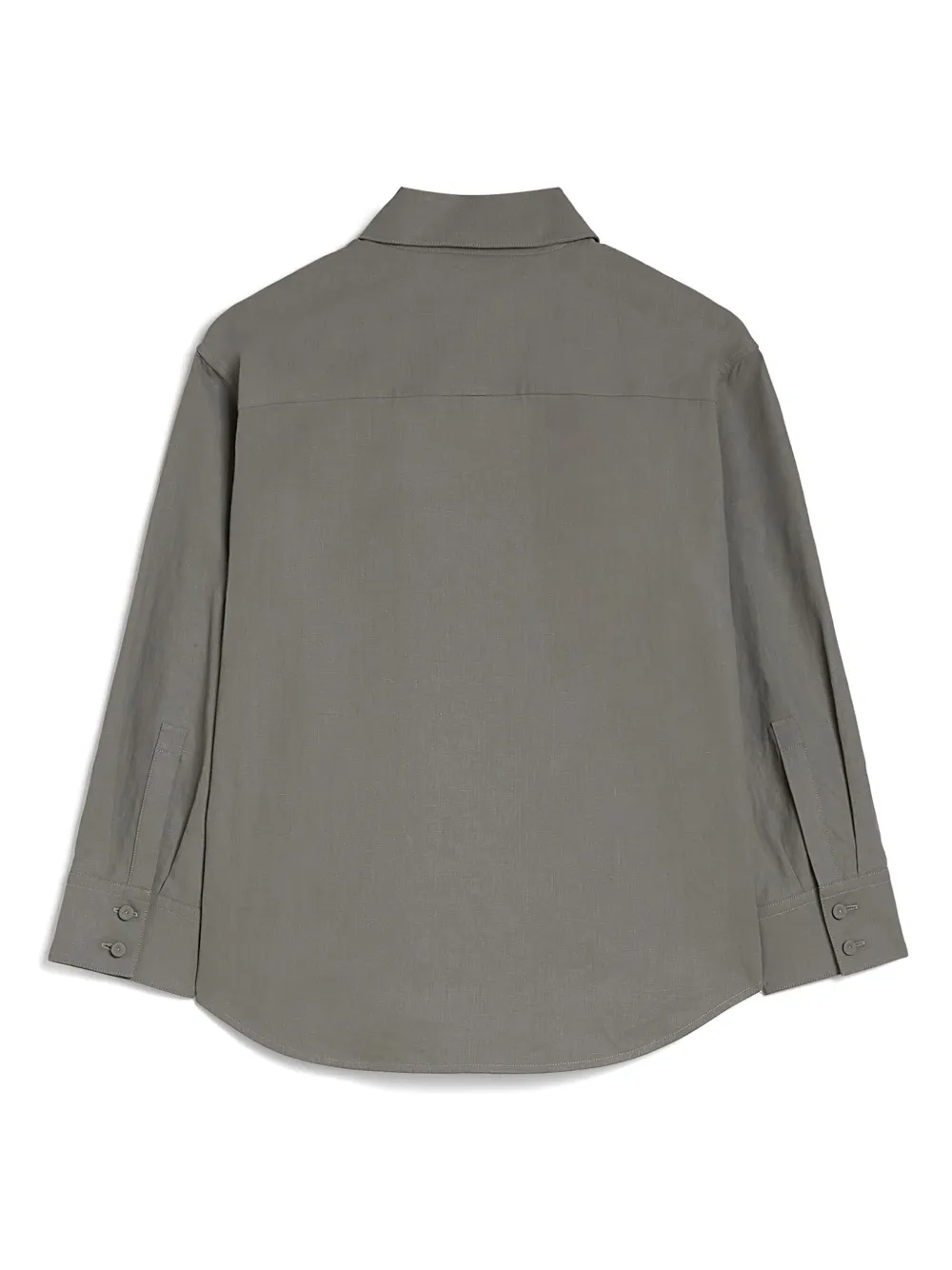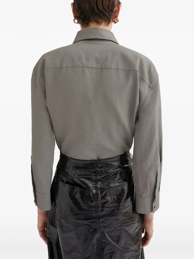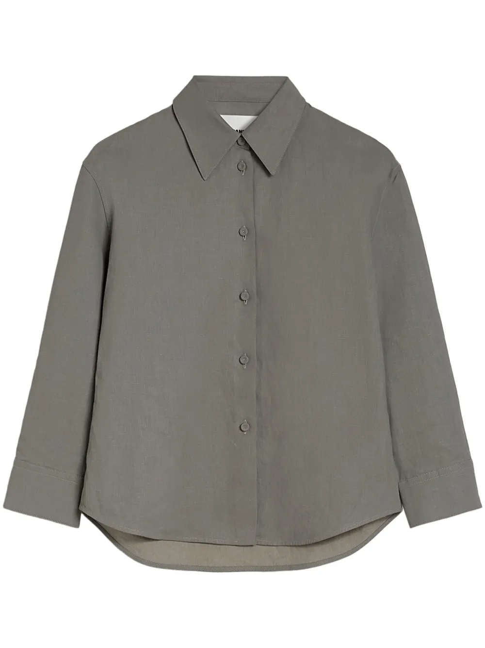 Camasa JIL SANDER Curved Hem gri, din in, cu guler clasic, inchidere cu nasturi, maneci cropped, mansete cu nasturi, logo interior si tiv curbat. Potrivita pentru sezonul primavara/vara. 100% in.